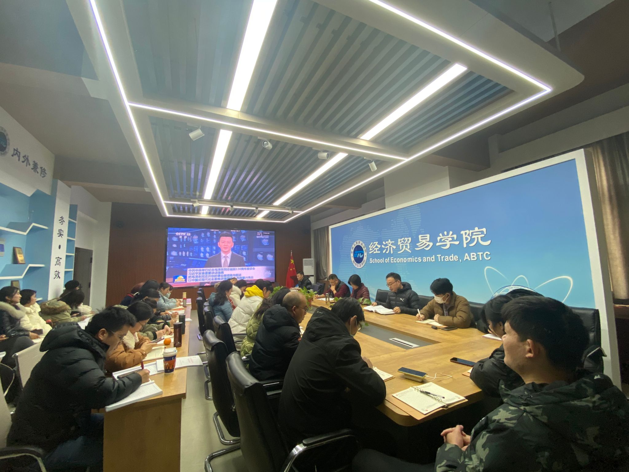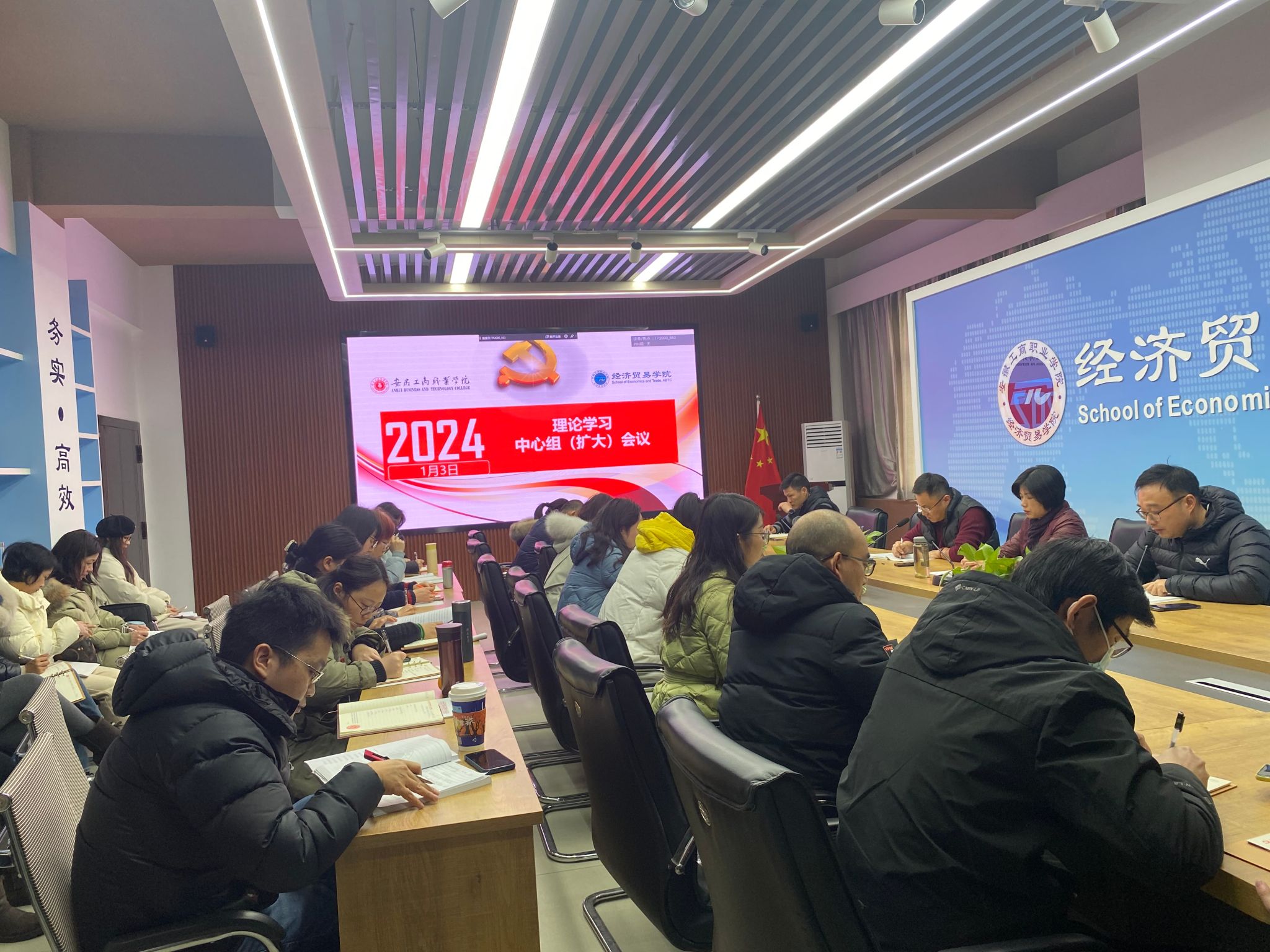1月3日下午,经济贸易学院党总支在5楼教师能力提升中心召开理论学习中心组学习(扩大)会议,会议由党总支书记边昊主持,全体教职工参加会议。
