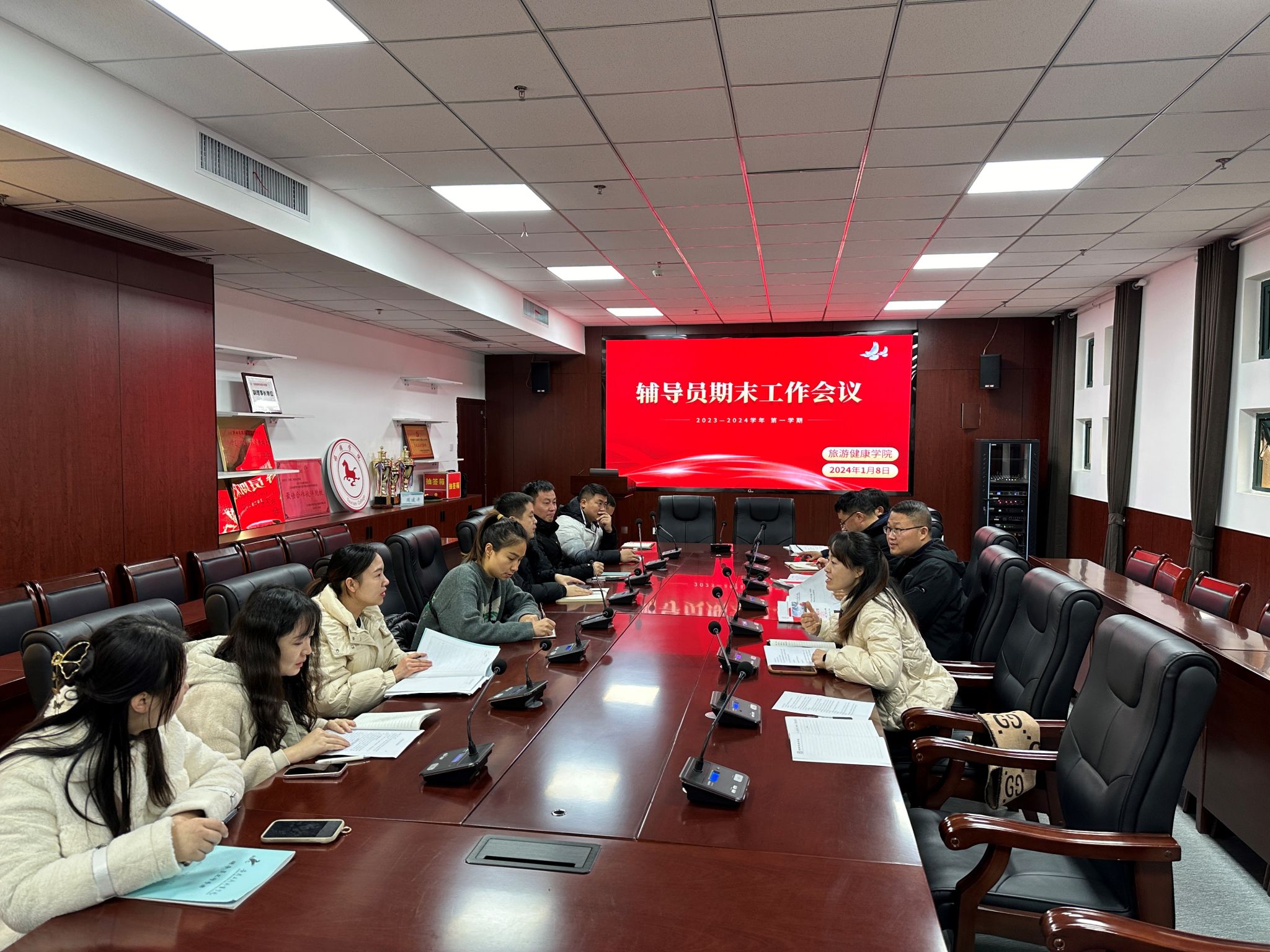 1月8日中午,旅游健康学院在学院会议室召开辅导员期末工作会议和辅导员工作坊交流活动,旅游健康学院党总支书记杨锐、学院全体专兼职辅导员参会,副书记刘燕主持会议。