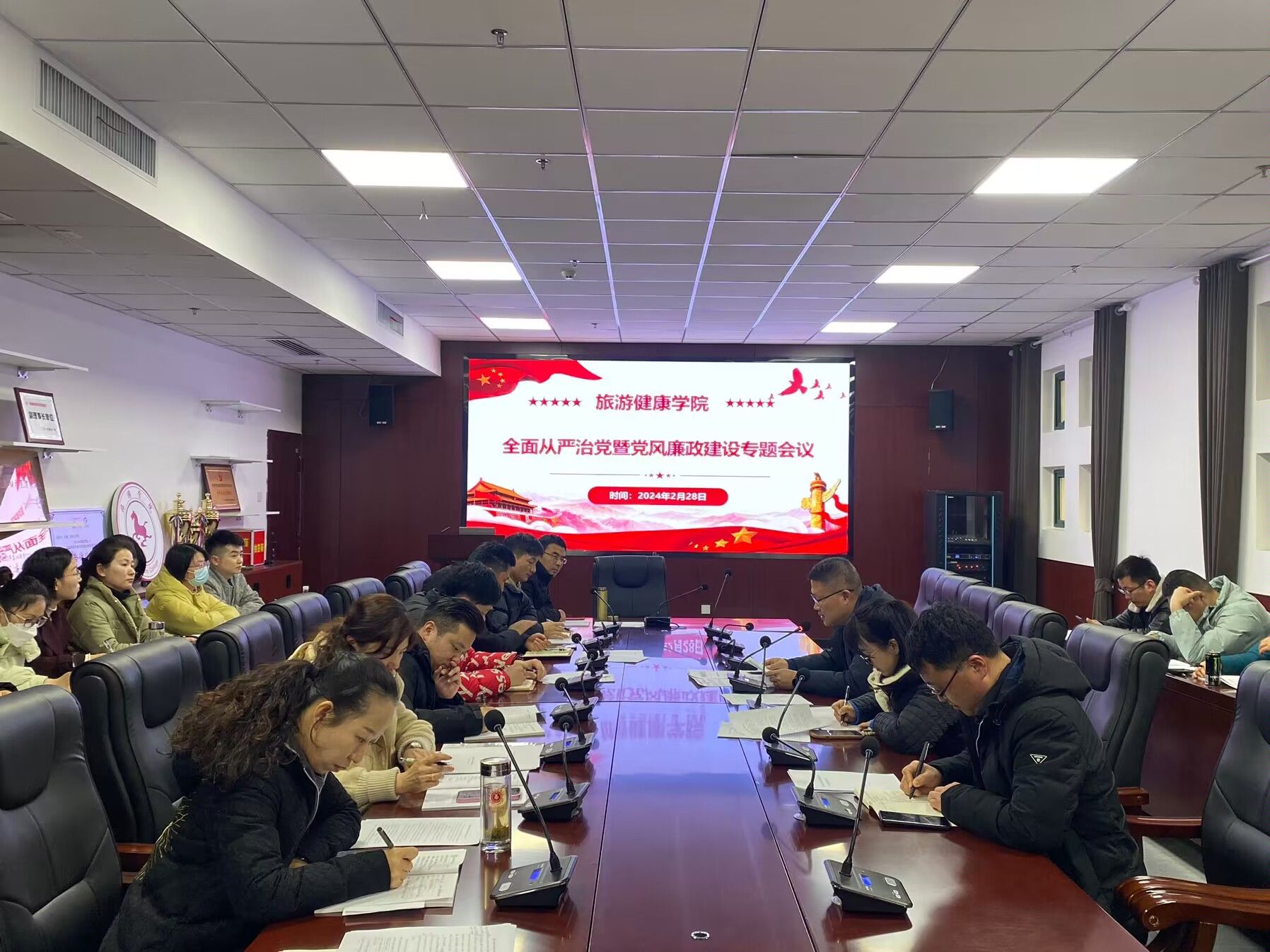 2月28日,旅游健康学院在学院三楼会议室召开全面从严治党暨党风廉政建设专题会议。会议由党总支书记杨锐主持,学院全体教师参加了会议。