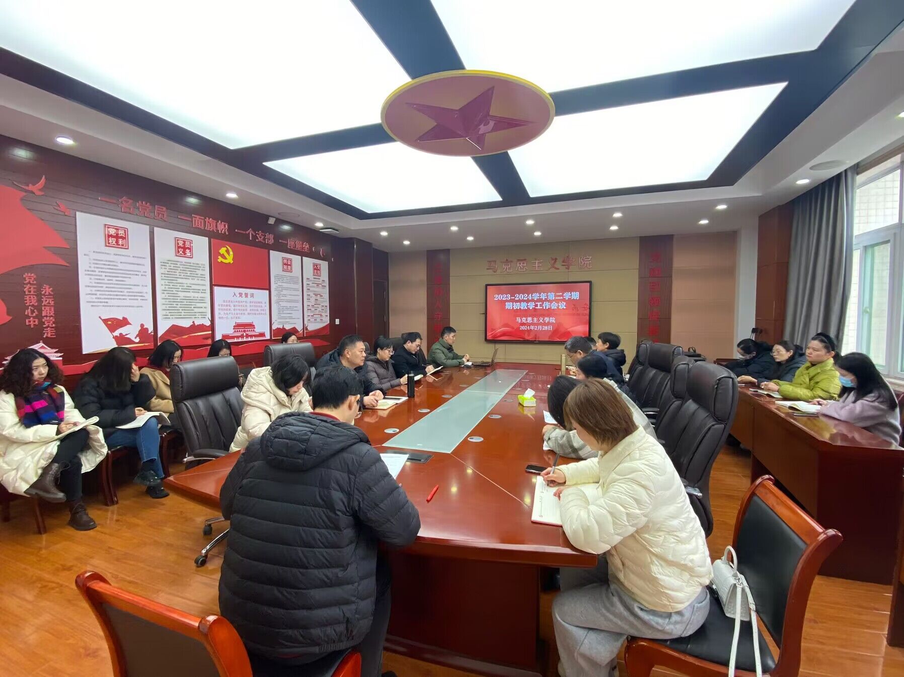 2月28日下午,世界第一大赌场,澳门金沙城中心召开新学期教职工会议,学院全体教职工参会,马院党总支书记、院长葛成飞总结发言,院副院长蒋强军主持会议。