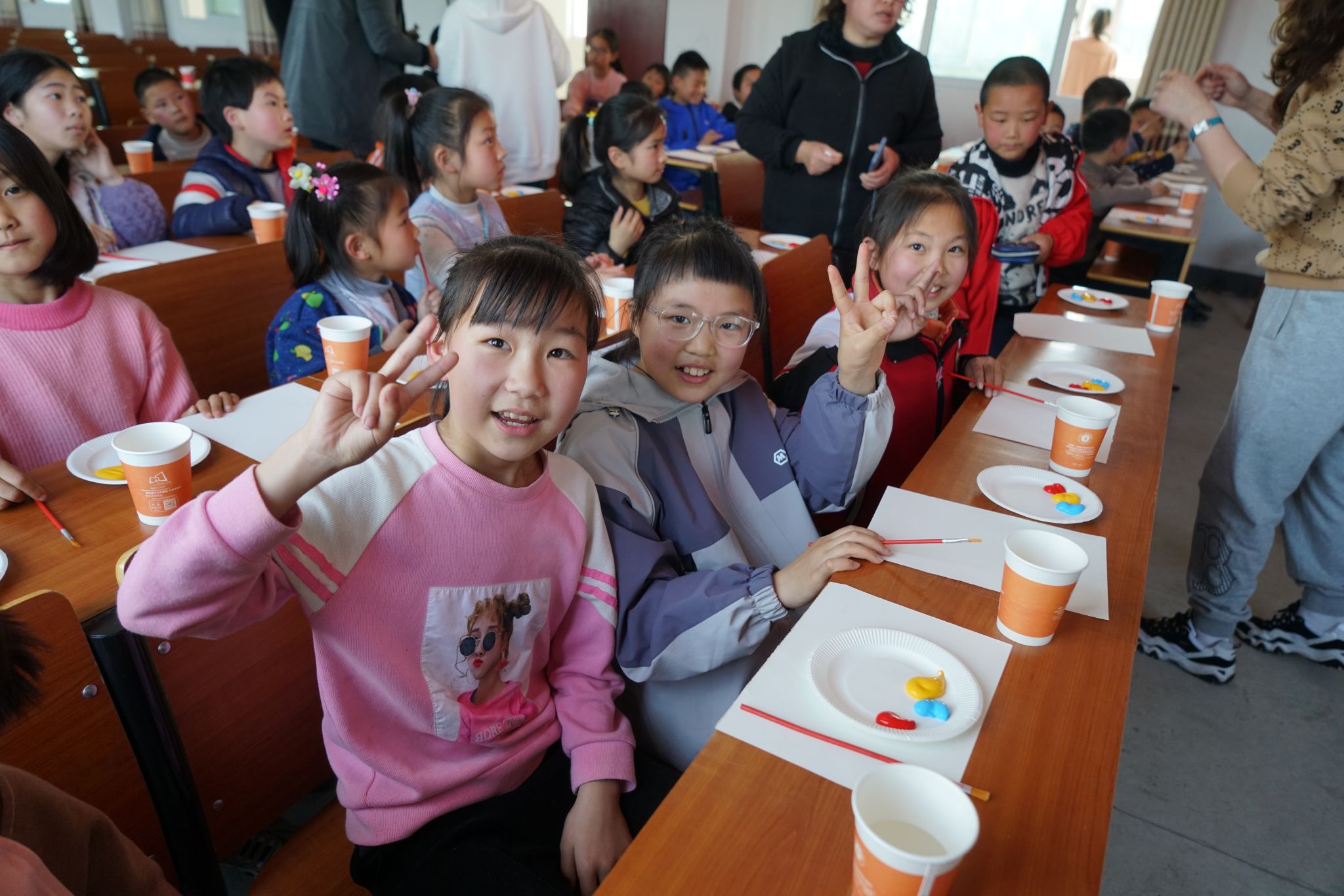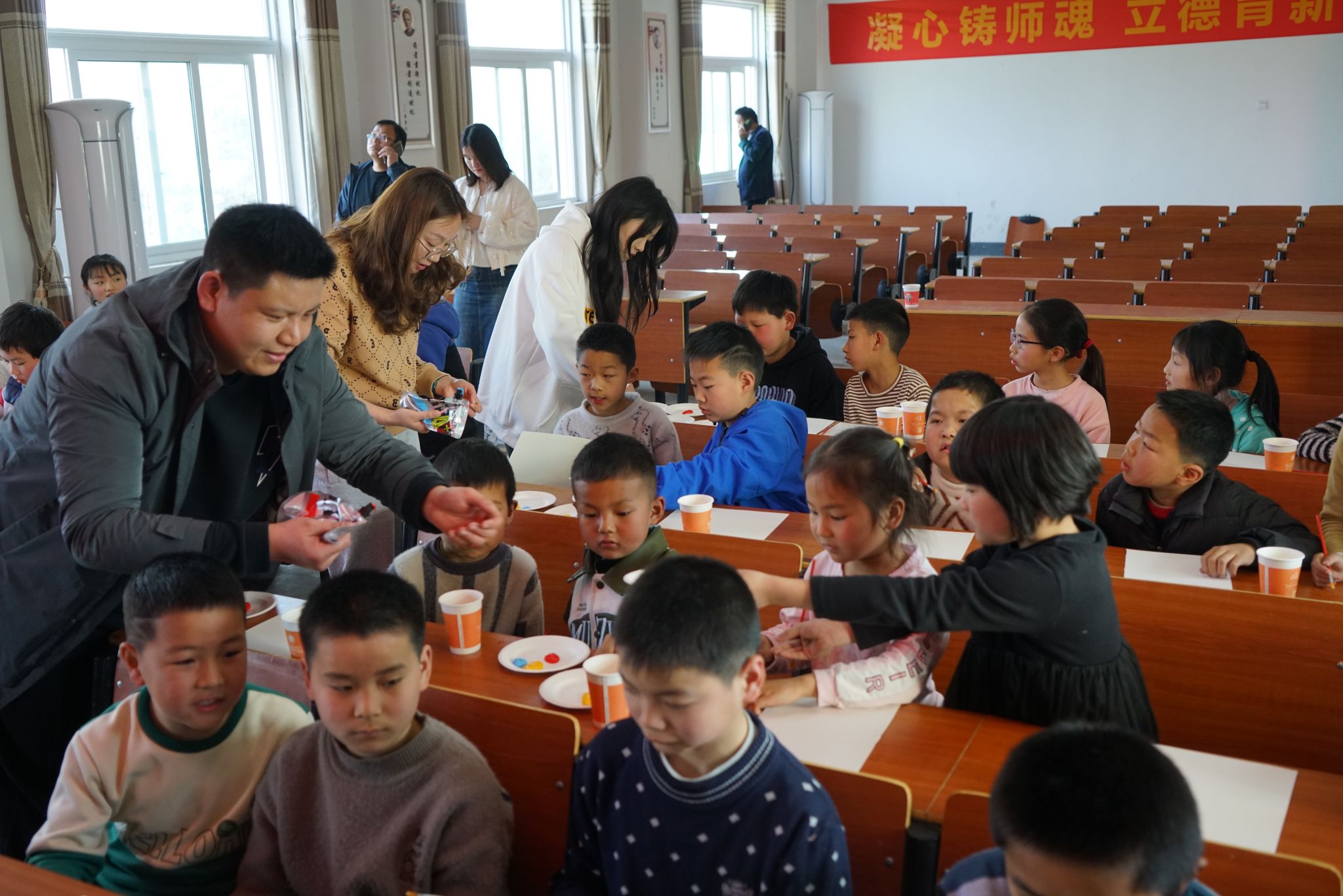 在城西乡树林小学,老师和同学们早早的等候在阶梯教室,对我院志愿者的到来报以热烈的掌声。为了帮助孩子们发现美、认识美、创造美,本次志愿团队精心设计了课程的每一个环节,并贴心的为孩子们准备好颜料、画纸、调色盘、洗笔杯等所有材料。志愿者与孩子们进行现场互动,面对面交流,手把手指导,向孩子们传授艺术作品构图、调色等绘画技巧,激发学生对美术课程的热爱,鼓励学生发挥自己的想象力和创造力,用现有颜料调配出各种不同的色彩,创造出独具特色的艺术作品。课上,孩子们开心的举着调色盘向志愿者老师们展示自己调制出的新颜色,分享创作的喜悦,认真感受色彩之美、艺术之美、文化之美。课程结束后,志愿者还给每一位学员分发了涂鸦画框,把艺术的种子深深的种在孩子们的心田里。