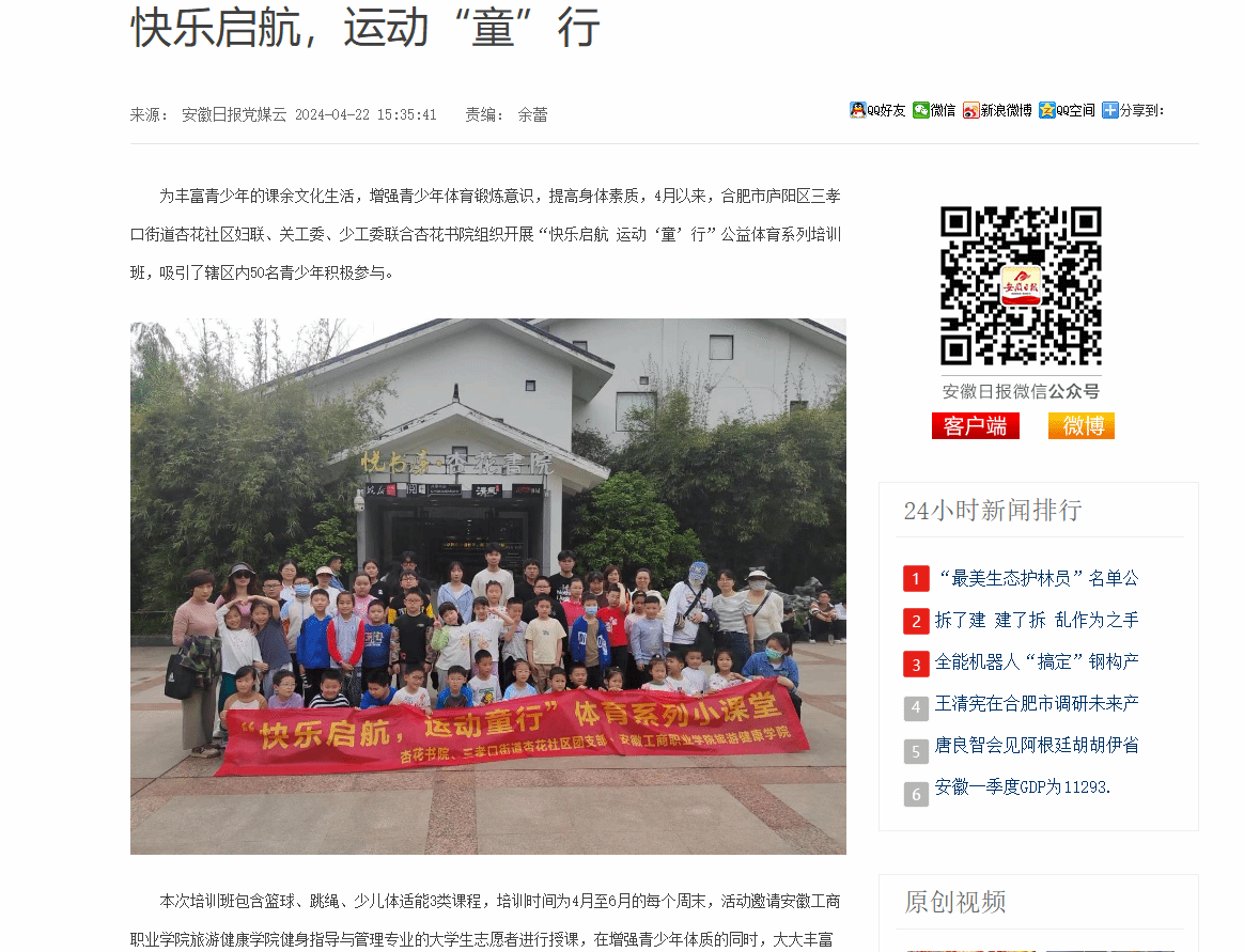 为深入学习贯彻党的二十大精神,大力弘扬志愿服务精神,培养学生的奉献意识和社会责任意识,不断深化“三全育人”综合改革,引导广大学生学好本领、服务社会。近日,旅游健康学院联合合肥市庐阳区三孝口街道杏花社区组织开展了“快乐启航 运动‘童’行”公益体育系列培训班,吸引了辖区内50名青少年积极参与,活动受到了安徽日报的关注和报道。