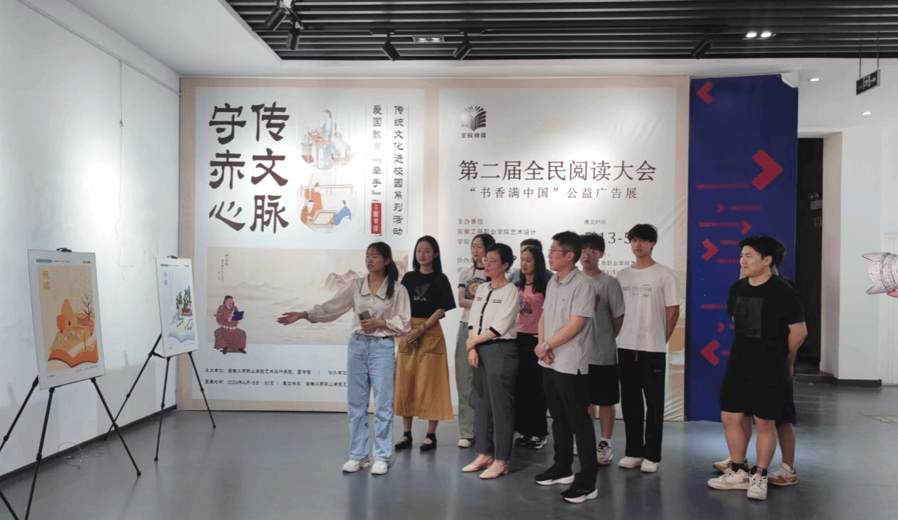 第二届全民阅读大会“书香满中国”公益广告展于5月15日在安徽工商职业学院庐阳校区合瓦·VISION艺术馆正式开展。艺术设计学院院长魏芬,党总支副书记张乐,部分专业教师、辅导员及22级、23级学生参观了设计展。