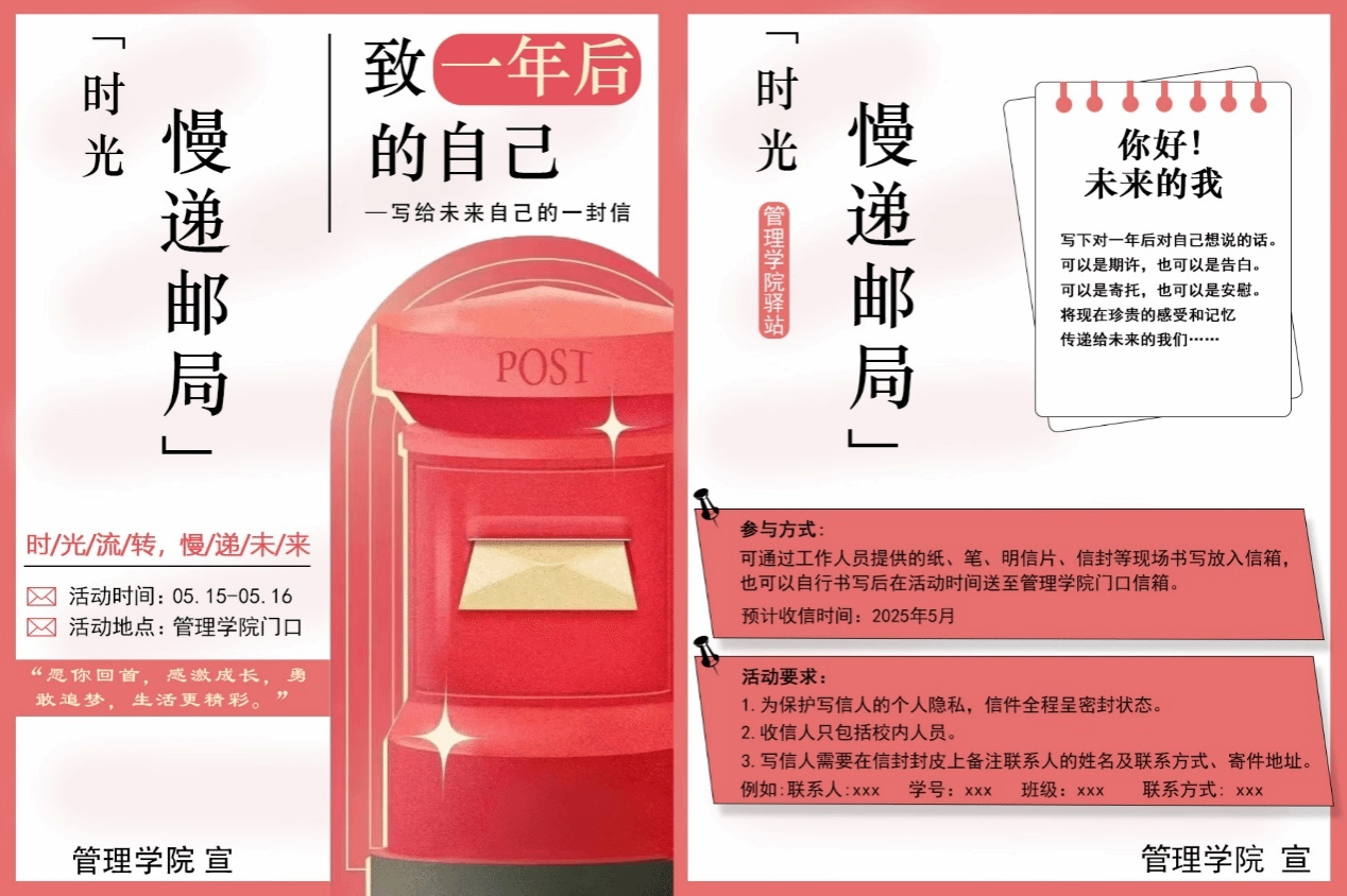 5月15日—16日,管理学院举办“时光慢递,流转未来”活动。本次活动以“给未来自己的一封信”的形式开展,旨在为同学们搭建一个表达情感与期许的平台,为同学们提供一个倾听内心声音、诉说当下感受、畅想未来发展的机会。