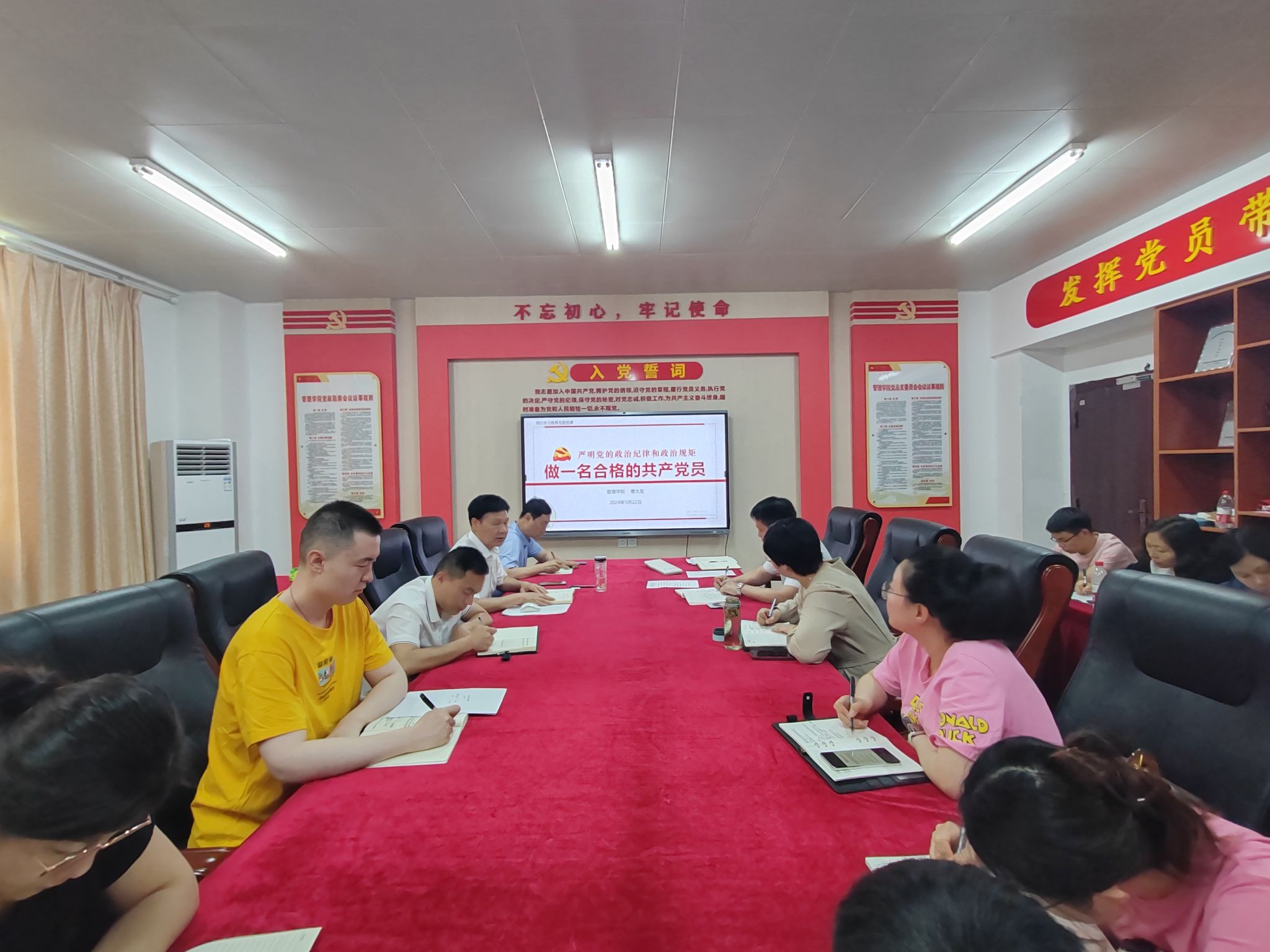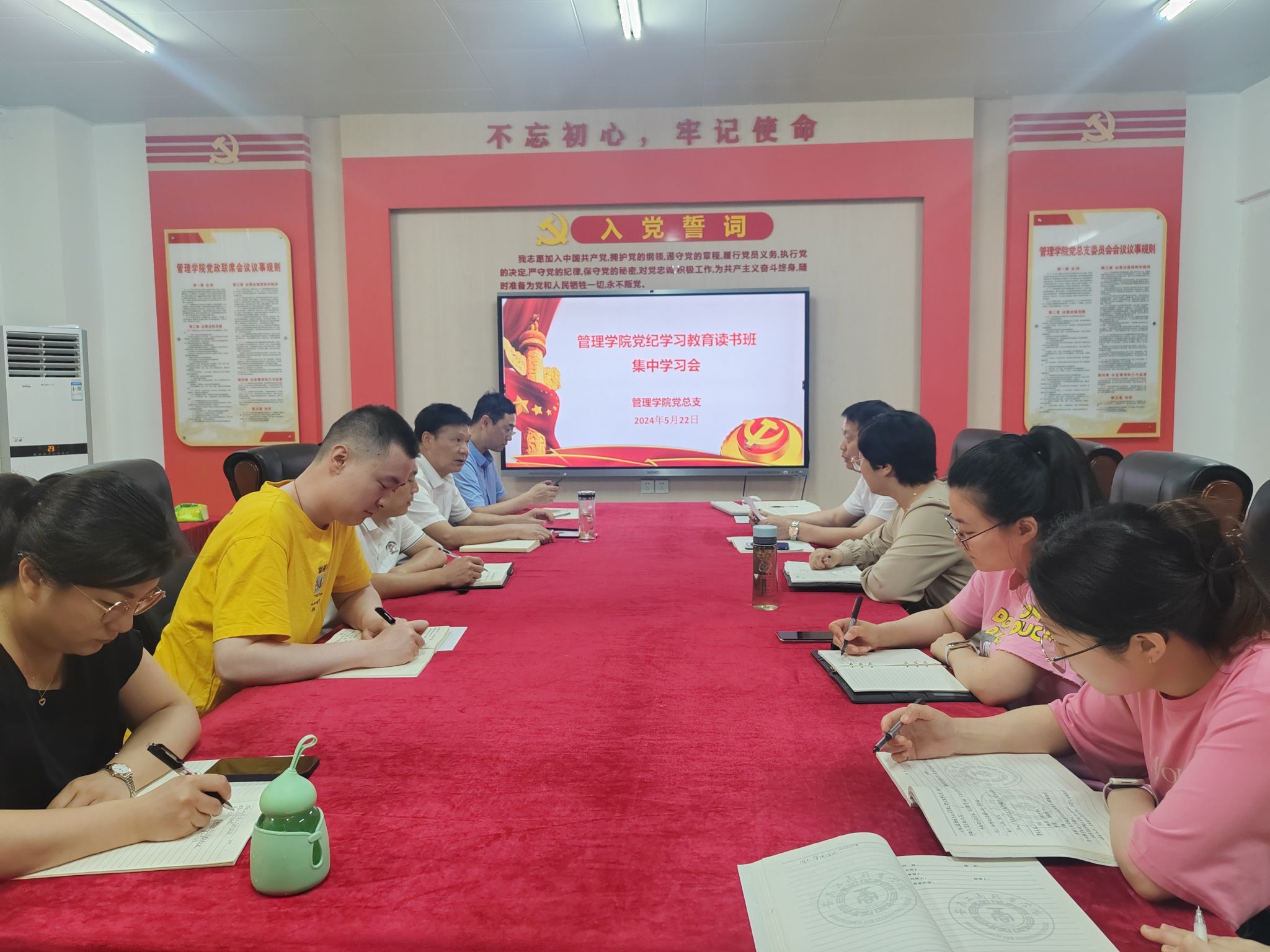 根据学校党纪学习教育工作安排,5月22日中午,管理学院在学院党员活动室召开党纪学习教育读书班集中学习会,通过领学带学原原本本、逐章逐条学习《中国共产党纪律处分条例》(以下简称《条例》),集中观看警示教育片《红线》,聚焦“六项纪律”开展交流研讨,实事求是查摆在学纪知纪明纪守纪方面存在的差距,自觉用党规党纪校正思想和行动。学院党总支副书记汪锋主持学习会,学院党总支书记曹大友作专题辅导报告。