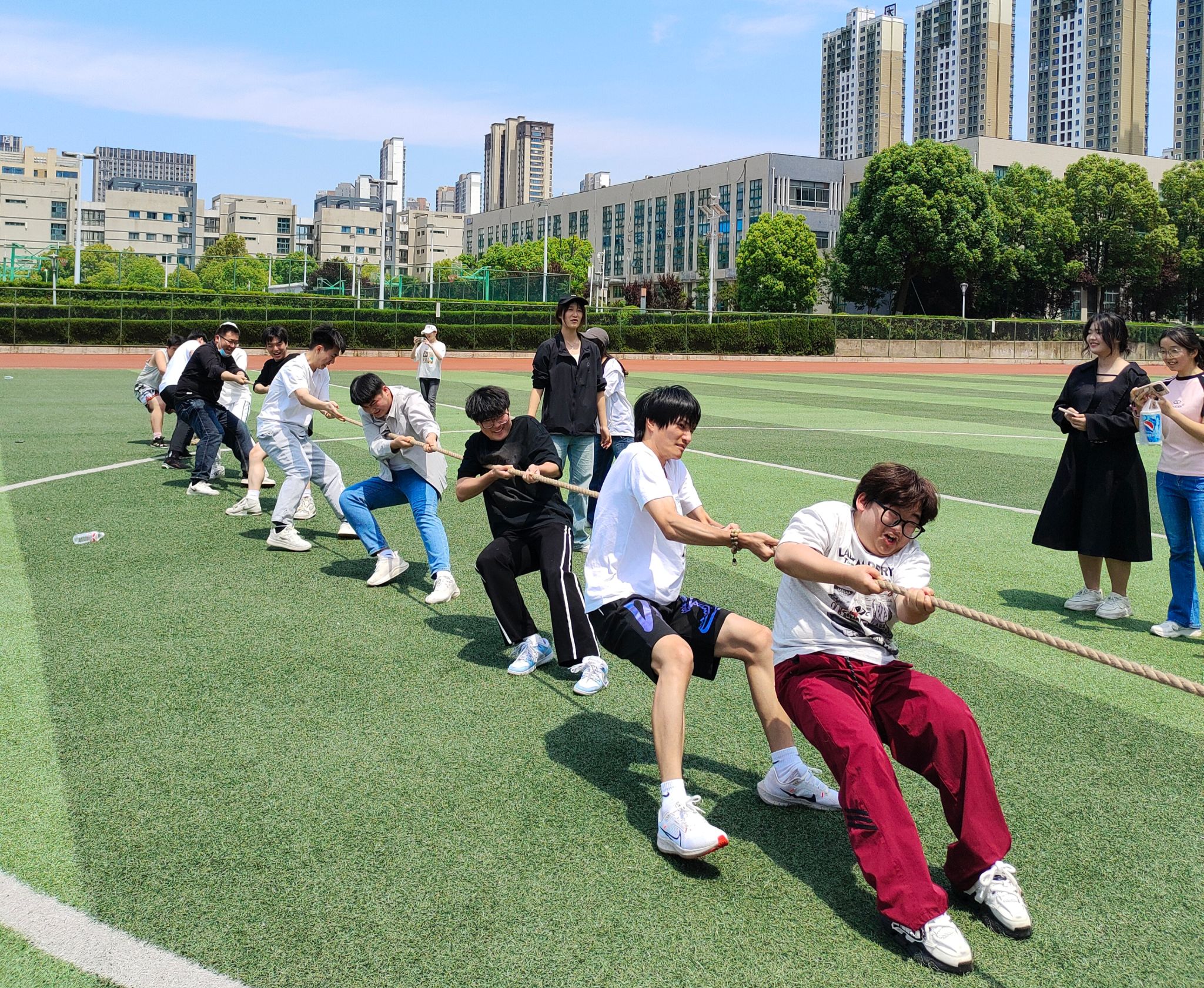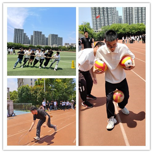 活动现场,同学们热情高涨,积极参与各项比赛。滚铁环、管道运球、企鹅漫步等传统体育游戏项目,不仅考验了同学们的平衡能力和协调性,也让他们在轻松愉快的氛围中感受到了团队合作的重要性;投壶、踢毽子等传统民间游戏,让同学们在竞技中重温了中华文化的魅力。特别是竹竿绕圈跑和拔河比赛,更是将活动现场的气氛推向了高潮。竹竿绕圈跑考验了同学们的敏捷性和团队协作能力,大家紧密配合,共同完成任务。拔河比赛则展现了同学们的拼搏精神和团队凝聚力,参赛队伍齐心协力,为荣誉而战。现场掌声、欢呼声此起彼伏。