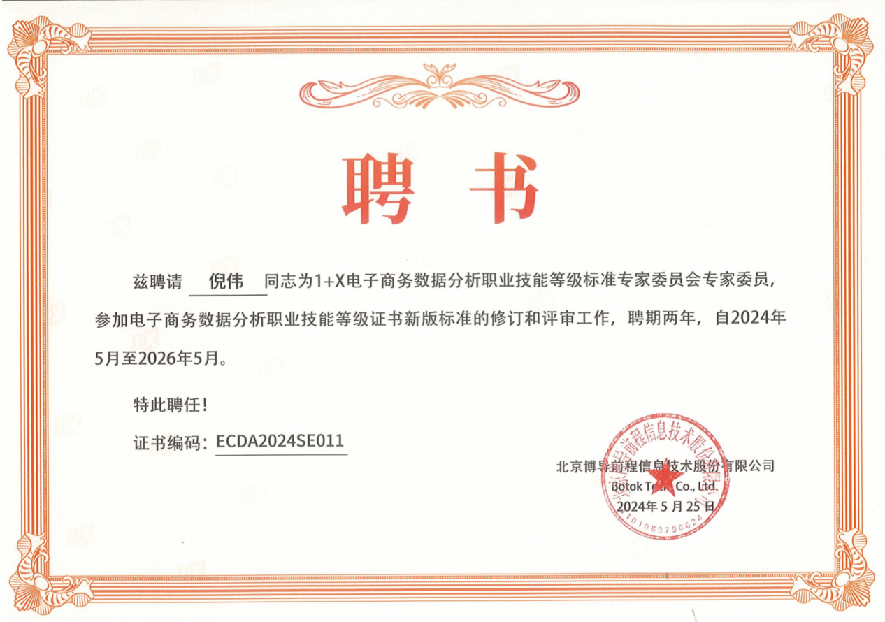 近日,管理学院副院长倪伟代表学校,受邀参加由北京博导前程信息技术股份有限公司主办的数字商业人才培养产教融合研讨会,并深度参与了1+X电子商务数据分析职业技能等级标准的修订研讨。倪伟被聘请为专家委员会委员,将参与新标准的修订与审核工作。