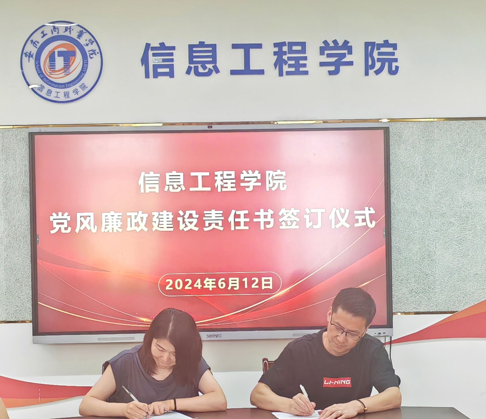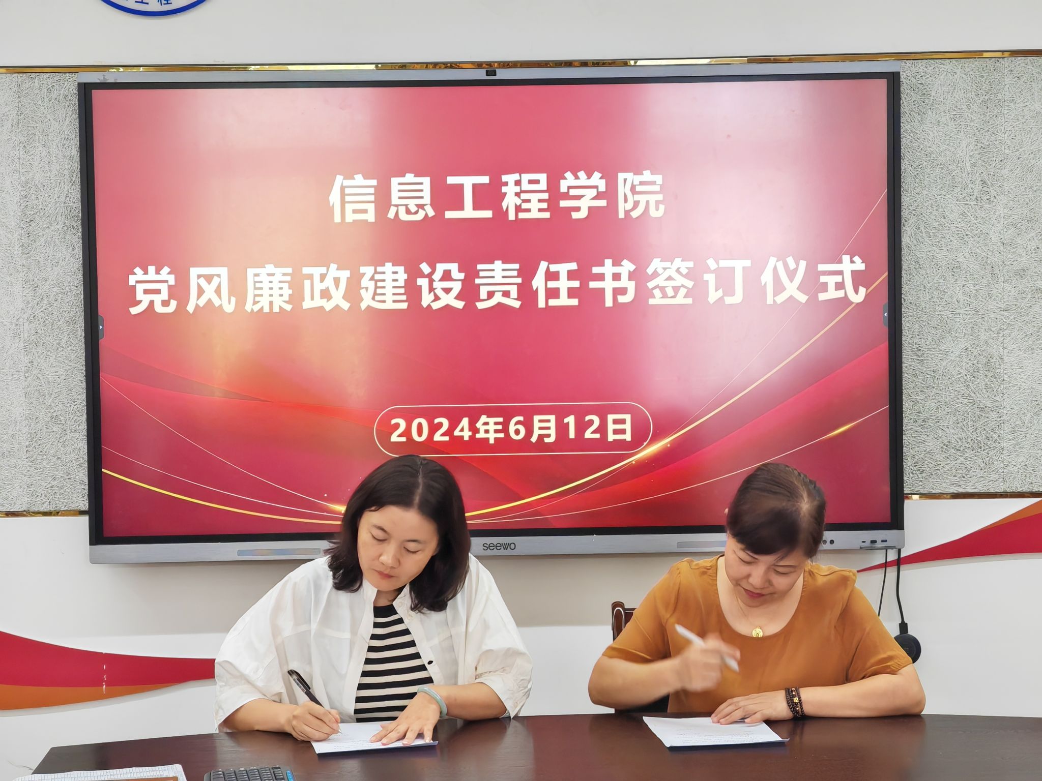 会上,还举行了党风廉政建设责任书签署仪式,学院领导分别与各部门、各党支部、教研室签订党风廉政建设责任书,进一步明确了任务,层层压实责任,推动我院党风廉政建设一级带动一级,严明“六项纪律”,增强了党纪学习教育的实效性。(撰稿:彭梦冉 审核:张静雯)