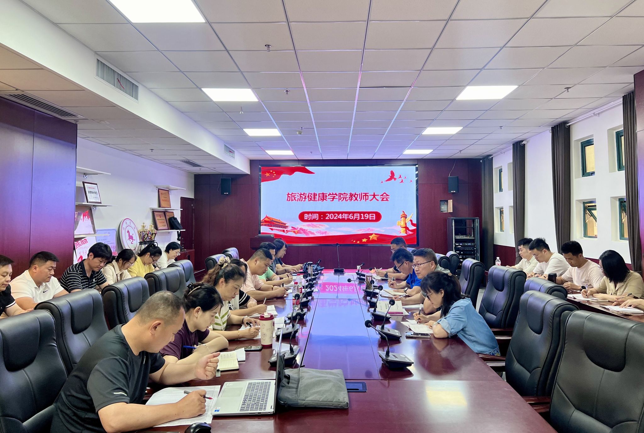 6月19日下午,旅游健康学院在学院会议室召开了期末全体教职工大会,学院领导和全体教职工参加了会议,会议由副院长王彦龙主持。