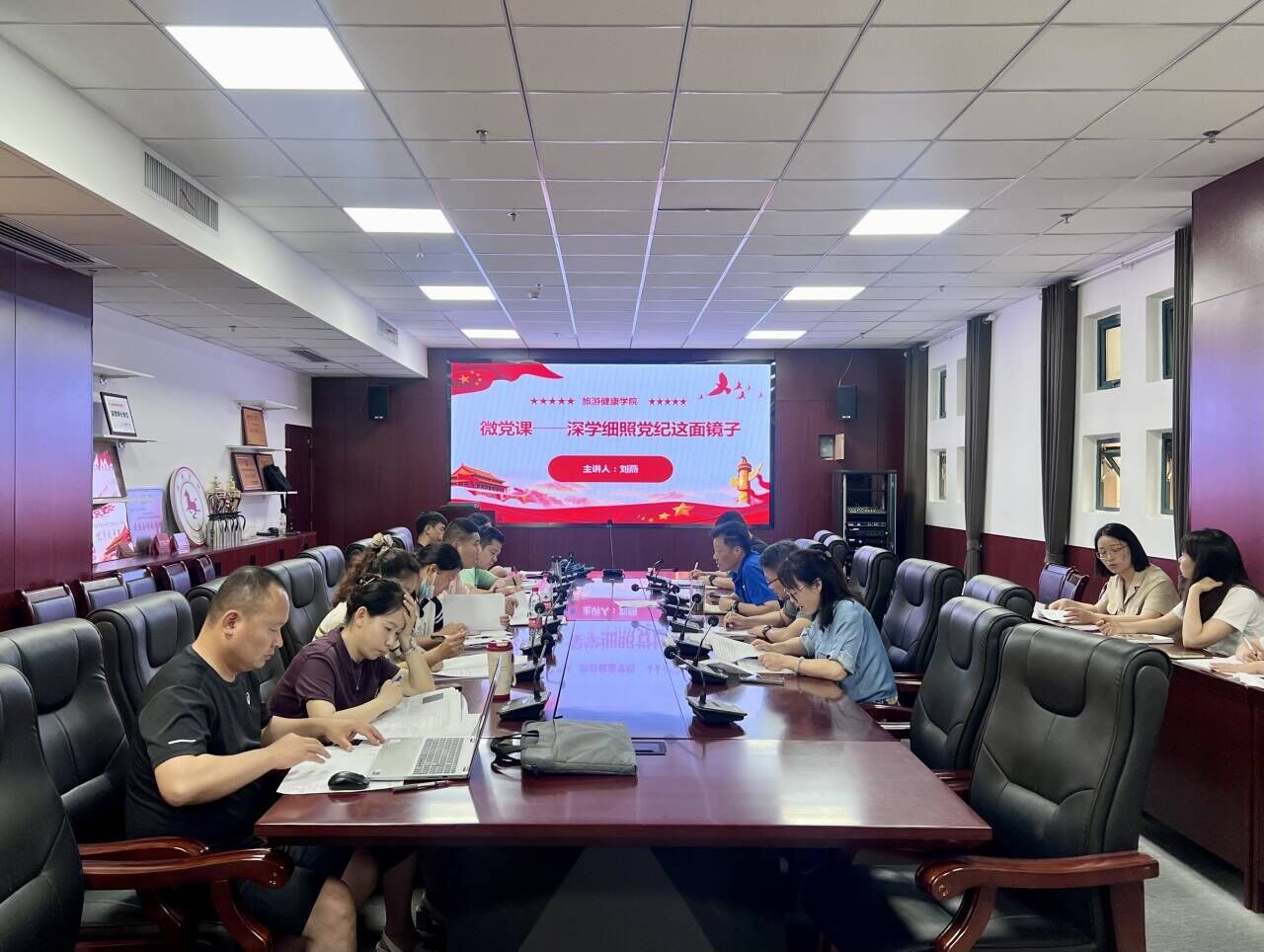 6月19日下午,旅游健康学院在学院三楼会议室召开二级中心组学习暨党纪学习教育读书班集中学习,学院党总支委员、全体党支部书记、教研室主任参加了会议,会议由党总支书记杨锐主持。