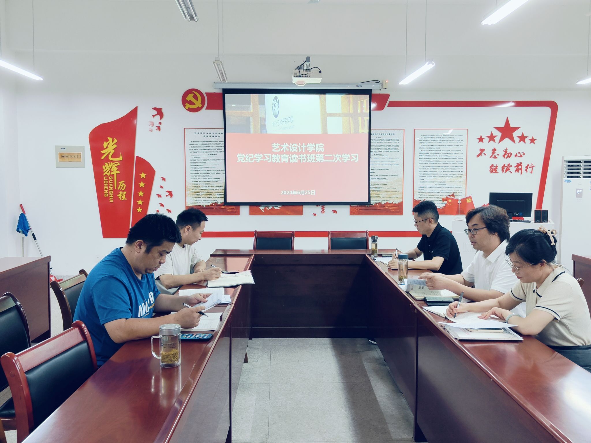 6月25日下午,艺术设计学院党总支在致知楼党员活动室召开党纪学习教育读书班第二次集中学习会议。校党委委员、党委宣传统战部部长、艺术设计学院党总支书记孔成,艺术设计学院党总支副书记、院长魏芬,艺术设计学院党总支副书记张乐和学院党总支委员参加学习。