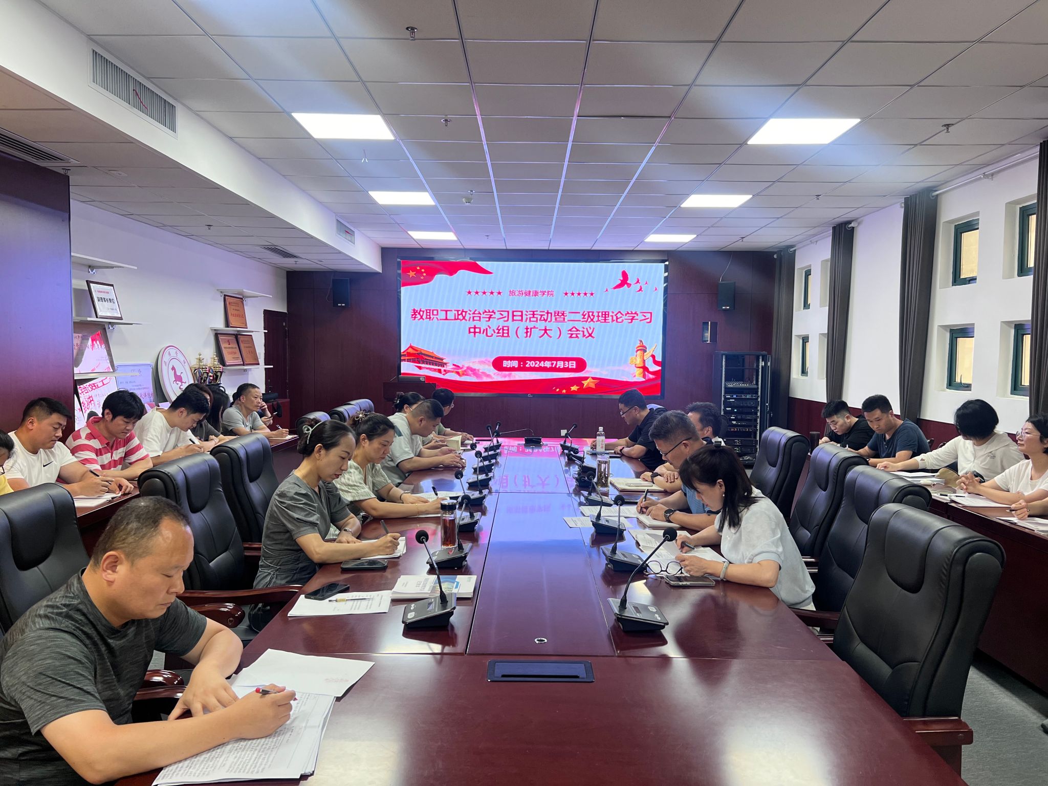 2024年7月3日,旅游健康学院党总支在学院会议室召开二级理论学习中心组(扩大)学习暨教职工政治理论学习会议,会议由党总支书记杨锐主持,全体教职工参加会议。