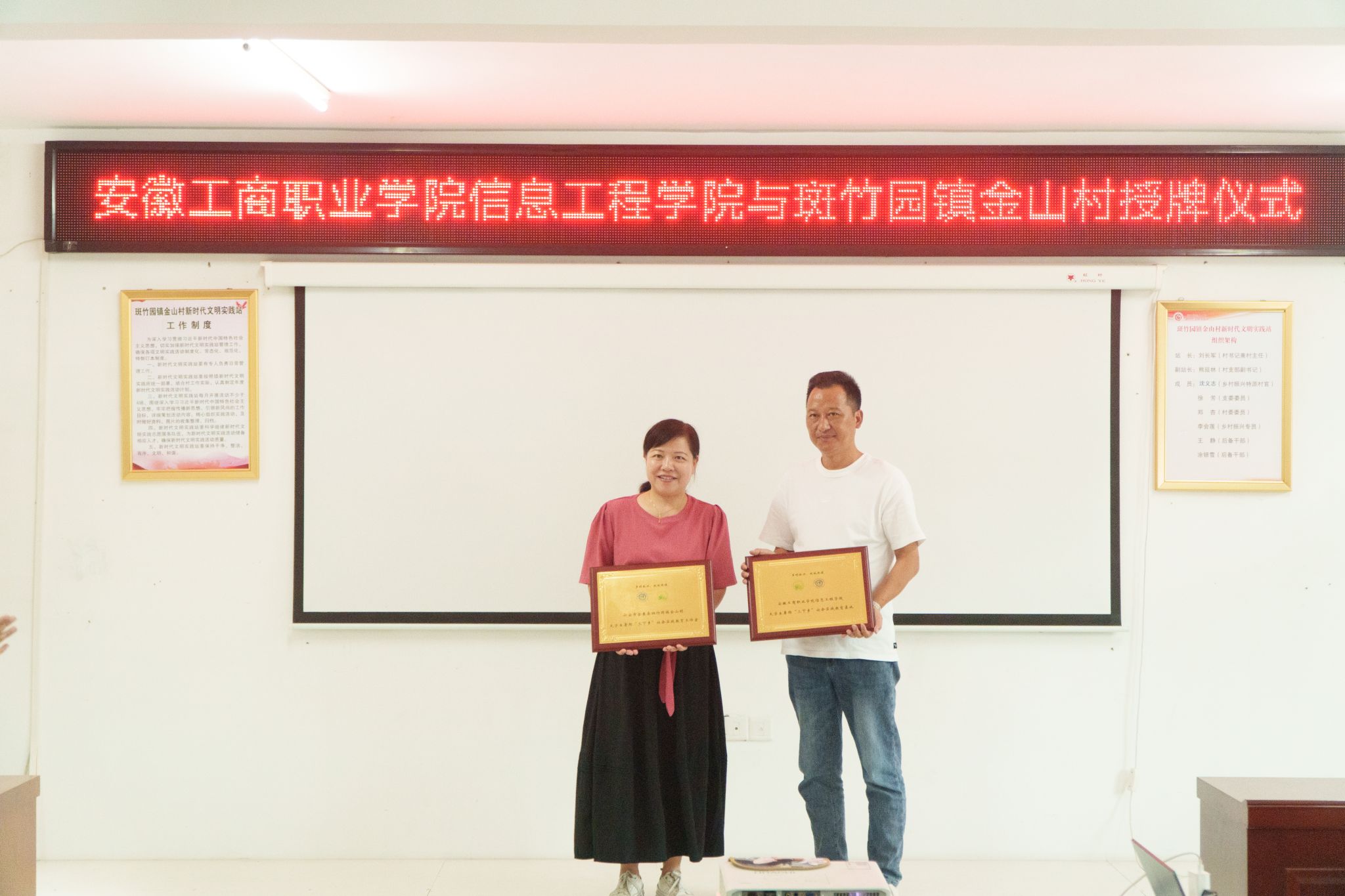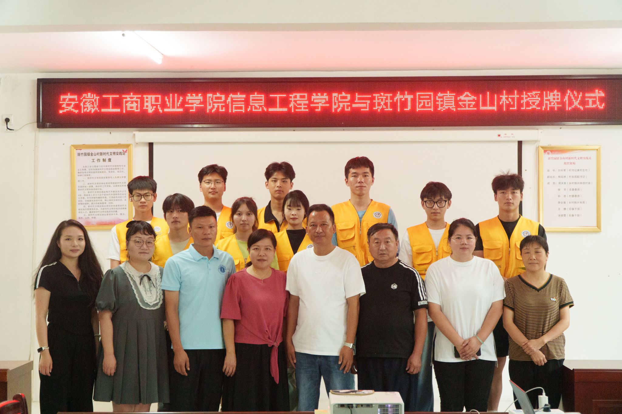 学院领导、老师与镇长史奋进、村书记刘长军等干部进行了详细交流,校地双方举行了大学生暑期三下乡社会实践教育基地揭牌仪式。张静雯表示,感谢金山村为大学生用所学专业,投身乡村振兴一线提供了宝贵的机会。我们的学子们怀揣“乡村振兴,强国有我”的美好愿景,带着美好梦想信念,挥洒辛勤汗水,学以致用,服务新农村建设,更希望双方的实践基地活动能持久、深入、有效地开展。携手斑竹园镇和金山村的领导和乡亲们一起努力实现绿水青山就是金山银山的理想!