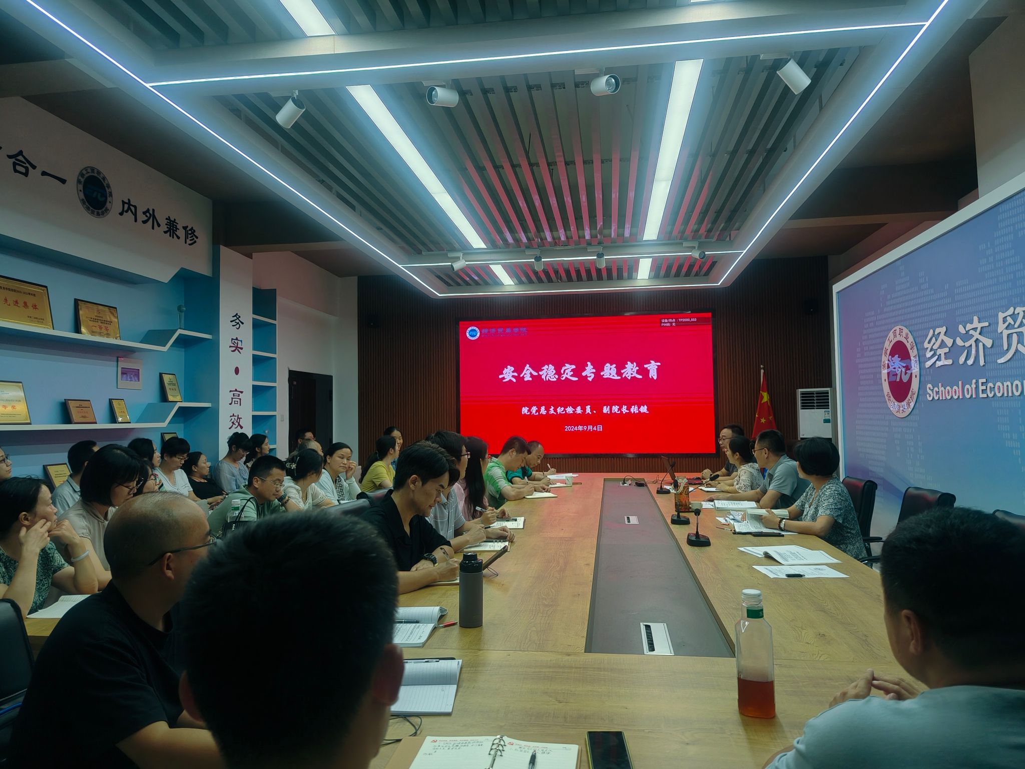 9月4日下午,经济贸易学院在5楼教师能力提升中心召开了安全稳定专题会议,会议由党总支书记边昊主持,学院副院长张键主讲,全体教职工参加。