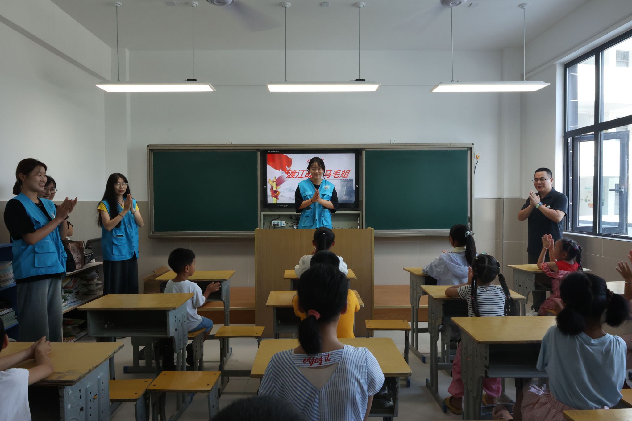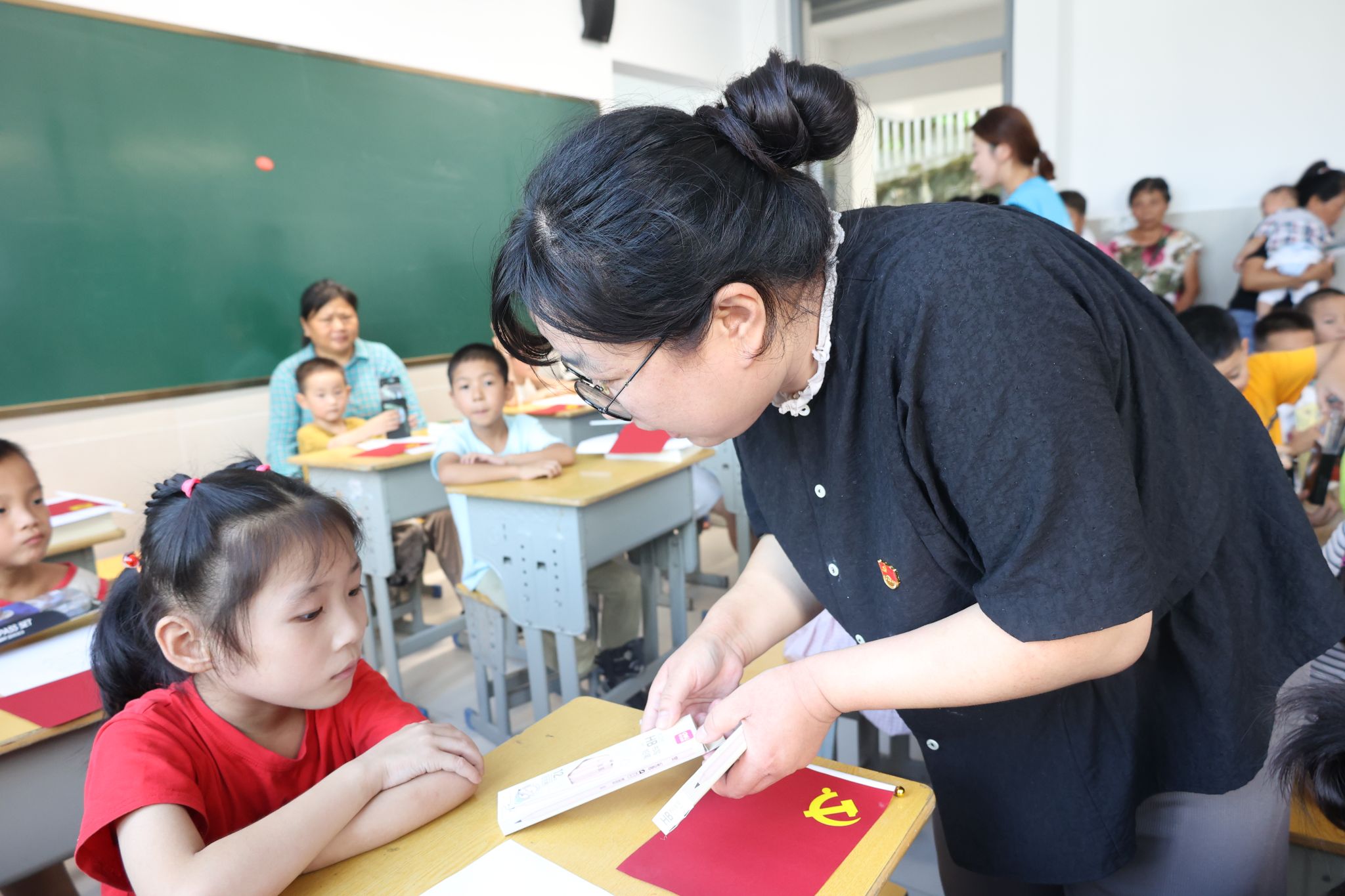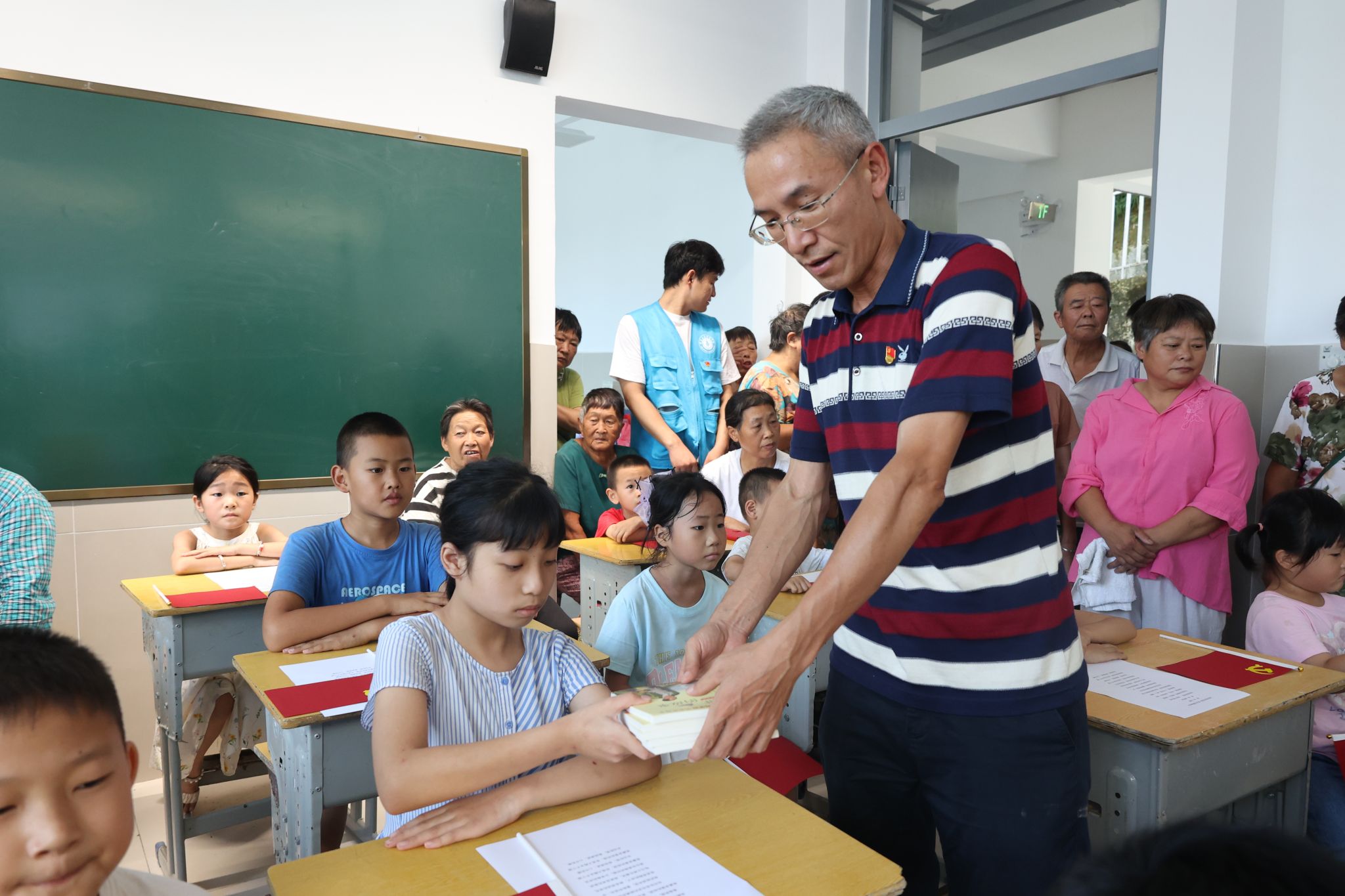 实践团队向新溪口乡的小学生们赠送《爱国主义教育丛书》一套,图书采取纪实文学的方式,选取了10个红色的典型故事,展现了烽火年代里中华儿女美好的人性、信念和理想。实践队员走到学生中一一和学生们解读图书中的故事,团总支书记杨东说:“今天大哥哥、大姐姐们给大家讲生动的红色故事,就是想把‘红色种子'播撒在少年儿童心间,帮助大家扣好人生的第一粒扣子,厚植爱党、爱国、爱社会主义的情怀,努力成长为堪当民族复兴大任的时代新人。”