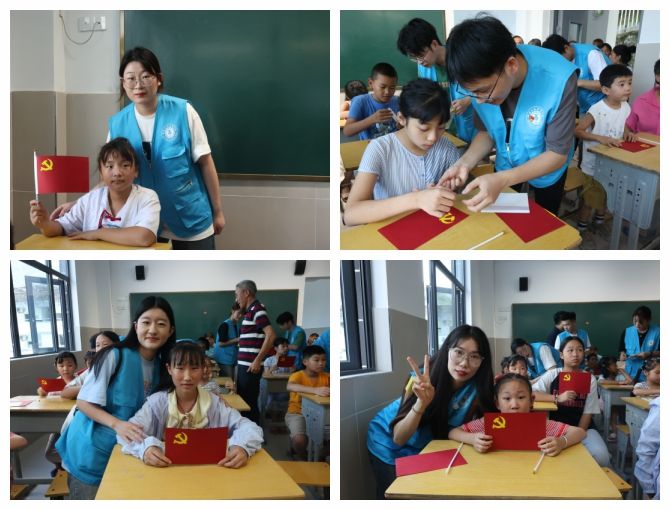 为了让小朋友们了解党员徽章的组成,实践团队带领孩子们制作党员徽章手工作品。首先,实践团队向小朋友们细致讲解党员徽章的构成要素,“党员徽章是由金黄色的镰刀和锤头组成,镰刀代表农民,锤头代表工人...”,小朋友们聚精会神听着大哥哥大姐姐们讲解党员徽章的组成和手工制作的步骤。讲解完毕,实践团队成员们俯下身子和身边的小朋友们共同完成手工制作,并写下了自己对祖国的热爱和美好祝愿。在实践队员们的协助下,一个个带有党员徽章的手工作品完成了。
