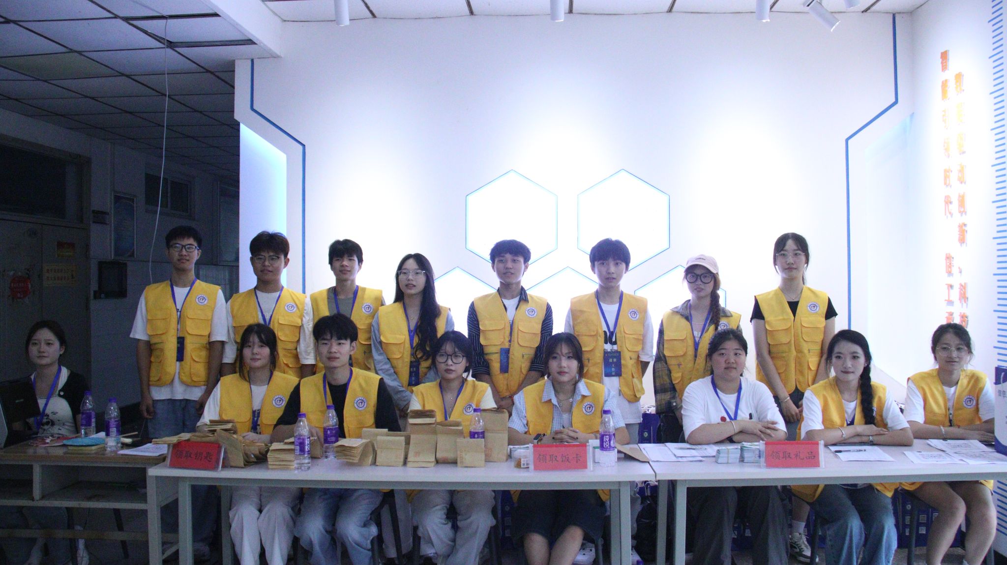 迎新工作如火如荼,到处可见“小黄人”那忙碌的身影。当新生和家长来到接待点时,迎新志愿者们立刻微笑相迎。一条条横幅挂列在空中,24级新生们踏着红毯,穿过迎新拱门立牌走进信息工程学院。学院设立了行李存放、迎新系统录入、人脸采集、钥匙一卡通发放、礼品领取等环节,最后志愿者会引导新生到达所在寝室。