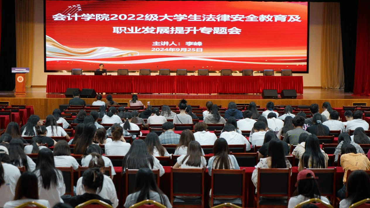 为充分做好2025届毕业大学生就业教育工作,强化大学生就业法律安全意识,增强毕业生自我保护能力,使同学们在毕业离校前形成崇法学法守法的良好风尚和对职业发展的正确认知。9月25日,会计学院联合国际交流与继续教育学院在双凤校区大学生活动中心举办了2022级大学生法律安全教育及职业发展提升专题会。国际交流与继续教育学院领导,2022级毕业班全体学生和辅导员参加。会计学院党总支副书记李峰主持。