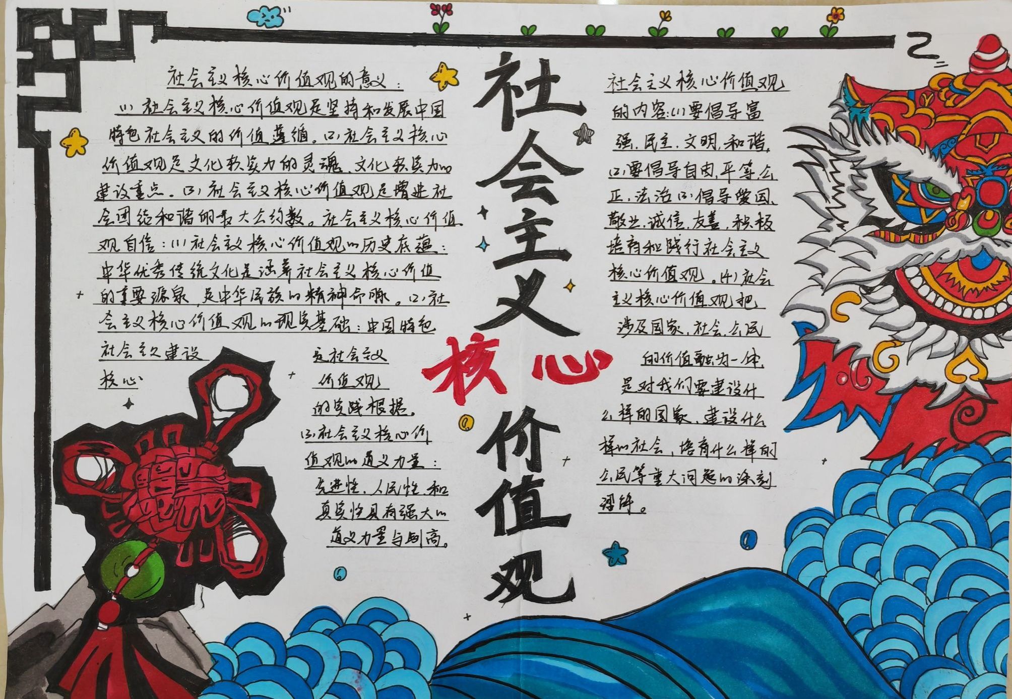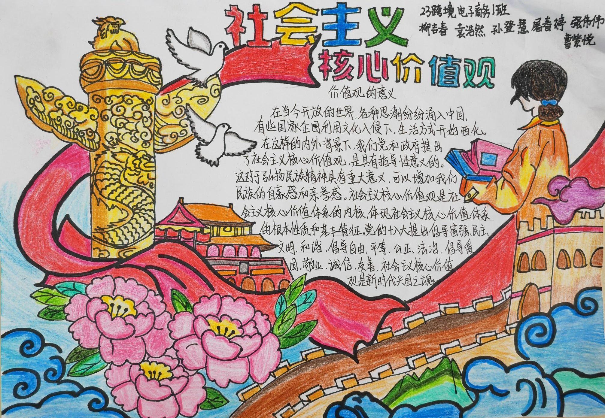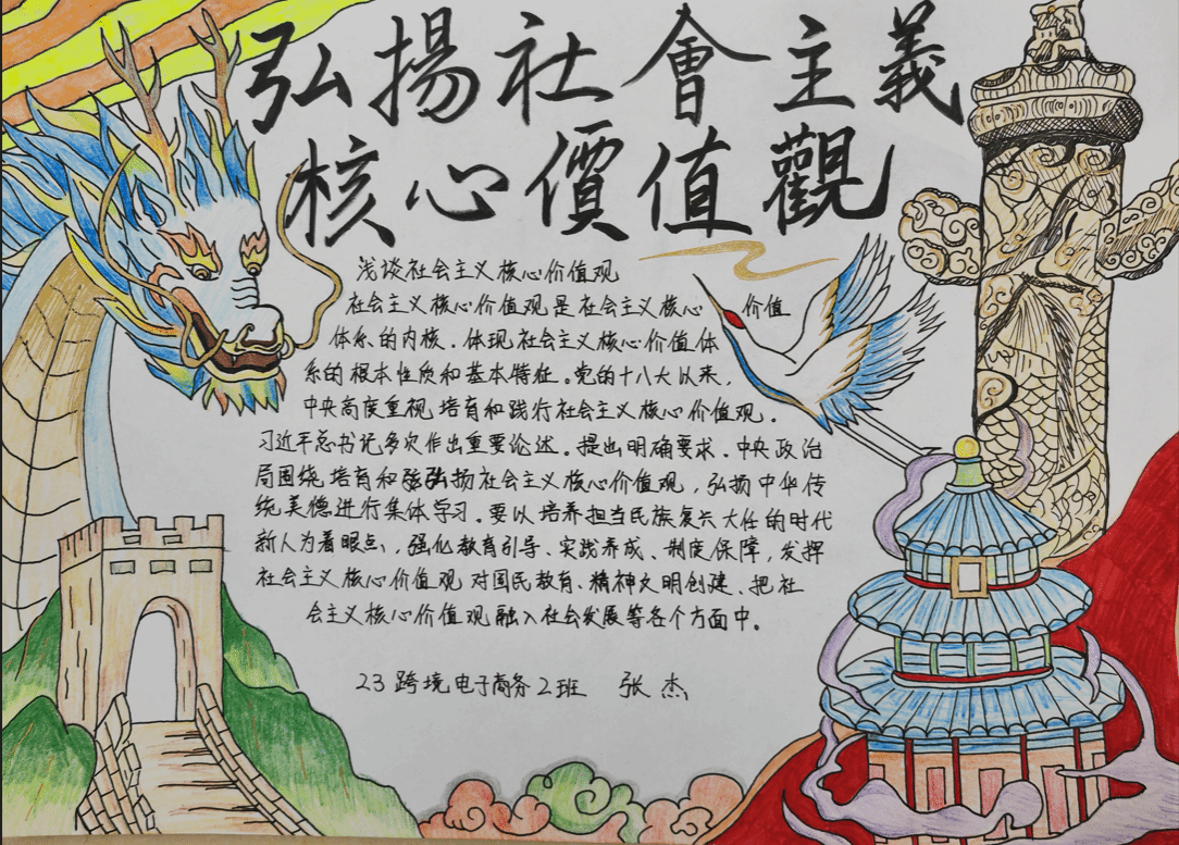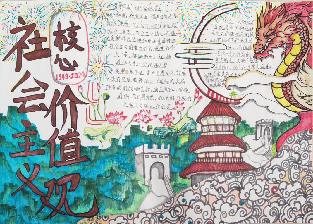 团总支举办以“践行社会主义核心价值观,我与祖国共奋进”手抄报比赛活动,同学们利用课余时间搜集了大量素材,为手抄报创作做好了充分的准备。活动中,同学们积极参与,充分发挥自己的想象力,精心设计,版面构图,绘制报头,内容选择。手抄报形式多样,内容丰富,紧扣主题,既突出了爱国主义情感,又彰显了学生的个性修养,在全面宣传社会主义核心价值观的基础上,也表达了同学们对待社会主义核心价值观积极的态度。同学们在写、画的过程中,更深刻地理解了社会主义核心价值观的丰富内涵和精神实质。