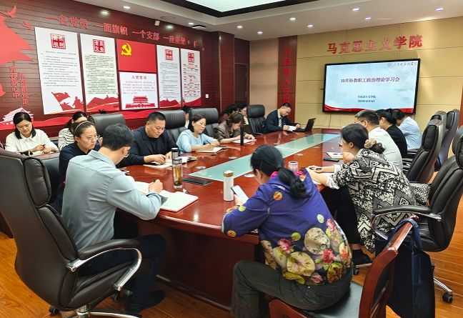 2024年10月9日,马院在明德楼会议室召开本年度第8次教职工政治理论学习会,深入学习习近平总书记在全国教育大会上的重要讲话精神、习近平总书记在庆祝全国人民代表大会成立70周年大会上的重要讲话精神以及习近平总书记在国家勋章和国家荣誉称号颁授仪式上的重要讲话精神。副院长蒋强军逐句领学了习近平总书记《论教育》中《做党和人民满意的好老师》篇章内容。马院全体思政教师参加会议,院长葛成飞主持会议。