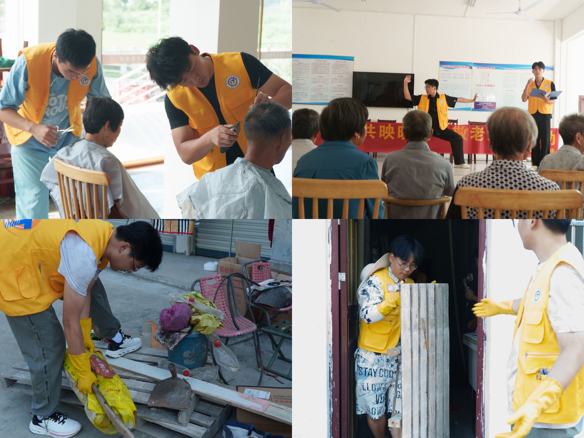 在金山村养老服务中心和低保户家庭,“携手夕阳,共映晚霞”敬老爱老活动如期进行,志愿者为老人们提供理发、卫生等服务,并通过文艺演出和健身活动为老人带去欢乐与健康,关爱老人,让晚年生活更加温馨幸福。志愿者在与老人的互动中感受浓浓的敬老情怀和厚重的社会责任感。