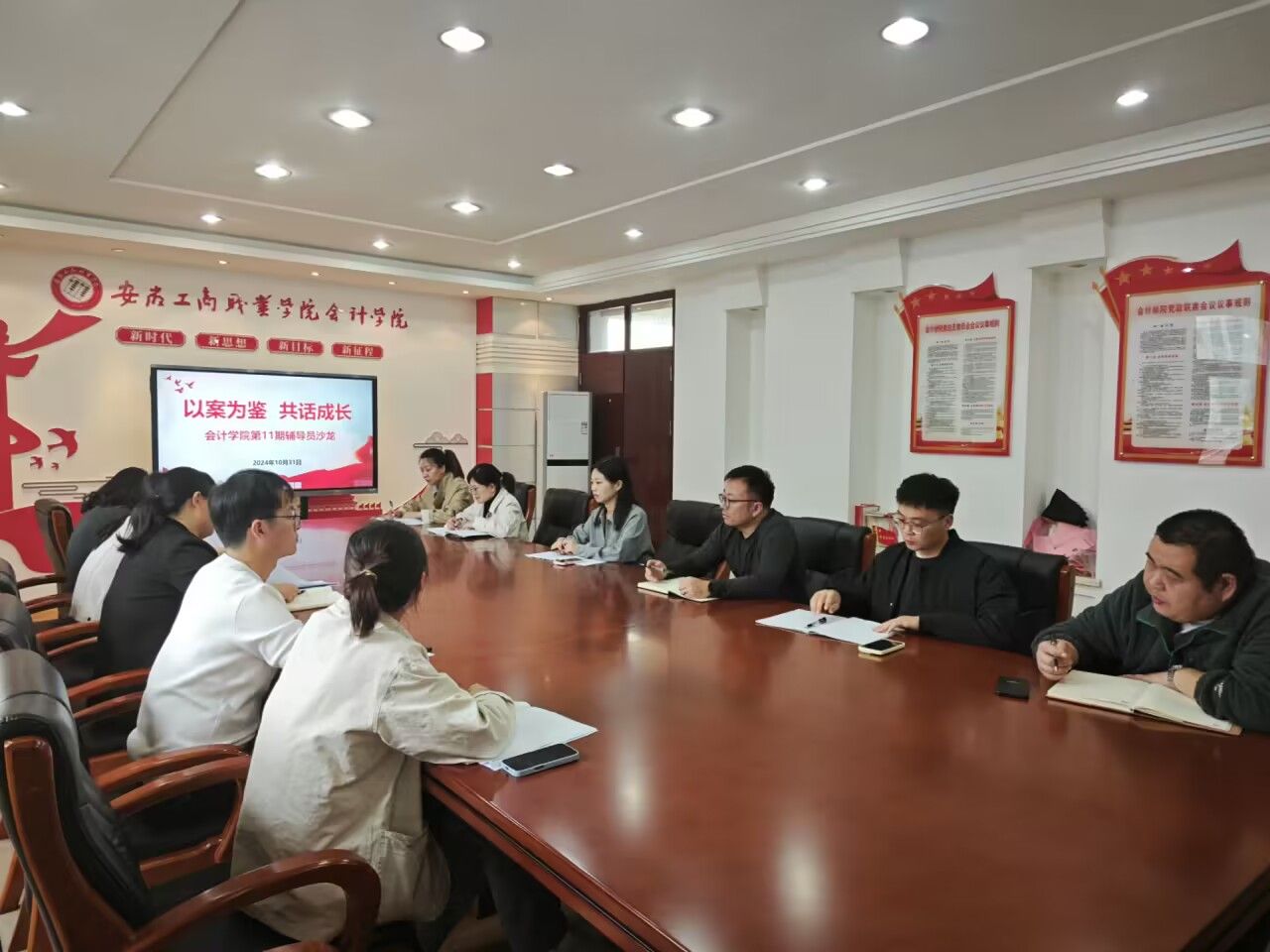 为进一步提升辅导员队伍的专业素质,进一步强化应对突发事件的应急处置能力,加强和改进学生教育管理工作,会计学院于2024年10月31日下午,在明德楼二楼党建会议室举行了以“以案为鉴共话成长”为主题的第11期辅导员沙龙活动。本次活动由党总支书记赵艳主持,全体专职辅导员积极参与。