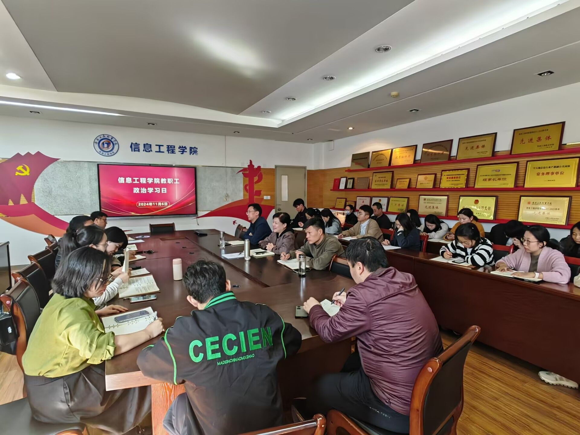 根据校党委统一部署,信息工程学院党总支于11月6日下午在党员活动室开展教职工政治学习日活动,全体教职工参加会议,会议由党总支书记张静雯主持。