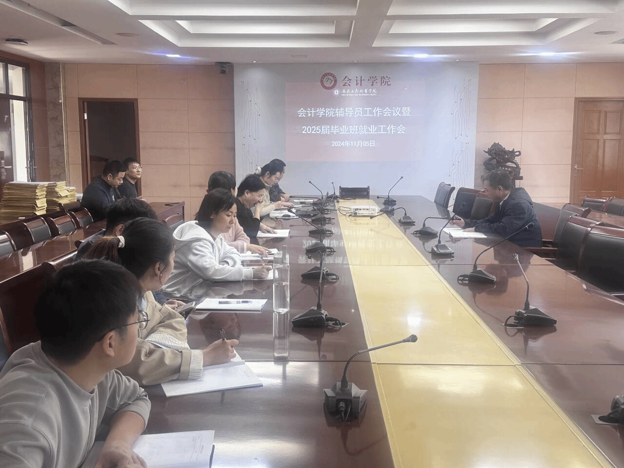 为顺利开展学生管理及毕业生就业工作,11月5日,会计学院召开辅导员工作暨2025届毕业班就业工作会议。2025届毕业班辅导员、学生科工作人员参加会议,院党总支副书记李峰主持会议。