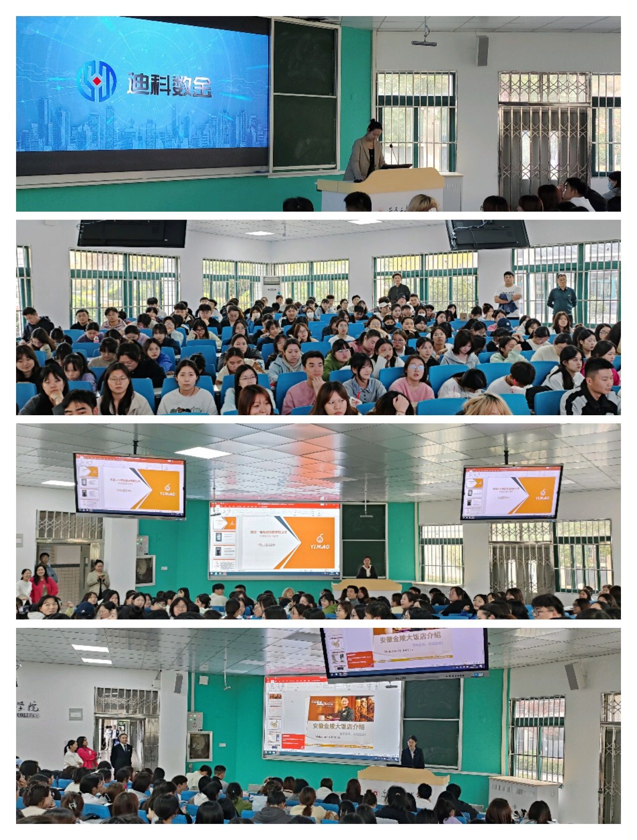 安徽迪科数金科技有限公司、安徽邻几便利店有限公司、安徽一毛餐饮有限公司、安徽金陵大饭店等四家企业分别从自己的成长历程、企业的资质和取得的荣誉、企业的业务特色特点、员工职业成长通道、薪资待遇、住宿环境等各个方面介绍自己的优势和特点。现场同学热情很高,通过互动交流,对即将毕业的自己有了更明晰的职业认识。