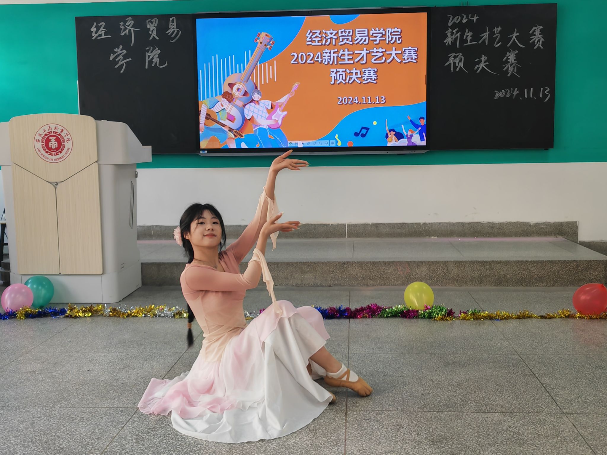 韶华不负启新程,青春作笔书华章;为丰富大学生校园文化生活,给新生提供一个展示自我、施展才华的舞台,促进彼此之间的交流与融合,11月14日经济贸易学院在B205教室举行“怦然‘新’动,‘才’华横溢”——新生才艺大赛,学院团总支书记邬金,辅导员朱清涟、支凤宁、刘雨梅和部分学生干部担任本次比赛评委,学院各专业学生观看了本次新生才艺大赛。