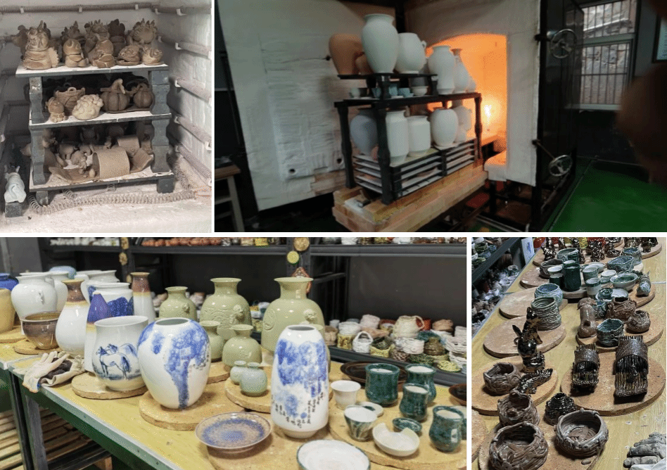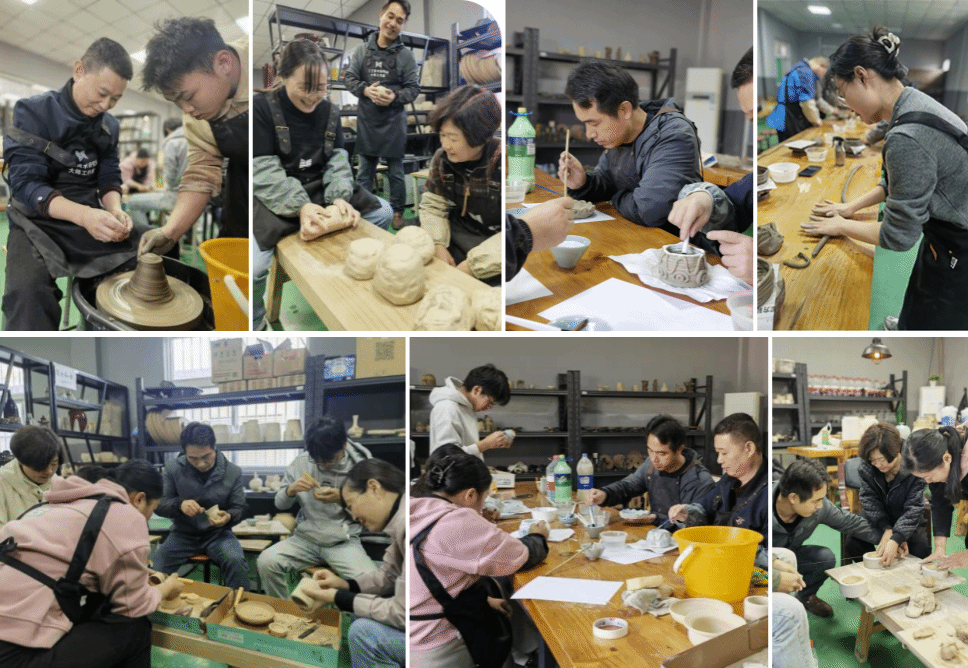 陶瓷系列培训过程中,安徽省工艺美术大师杨帆、全国技术能手余志贤和陶艺工作坊教师团队共同带领学员完成了陶瓷从泥坯成型到烧制成品的一条龙生产过程,具体包括:①盘条成型工艺学习与实践②捏塑成型工艺学习与实践③拉坯成型工艺学习与实践④修坯工艺学习与实践⑤模制成型工艺学习与实践⑥青花工艺学习与实践⑦施釉工艺学习与实践⑧烧窑工艺学习与观摩,培训内容全面、系统、专业、生动。