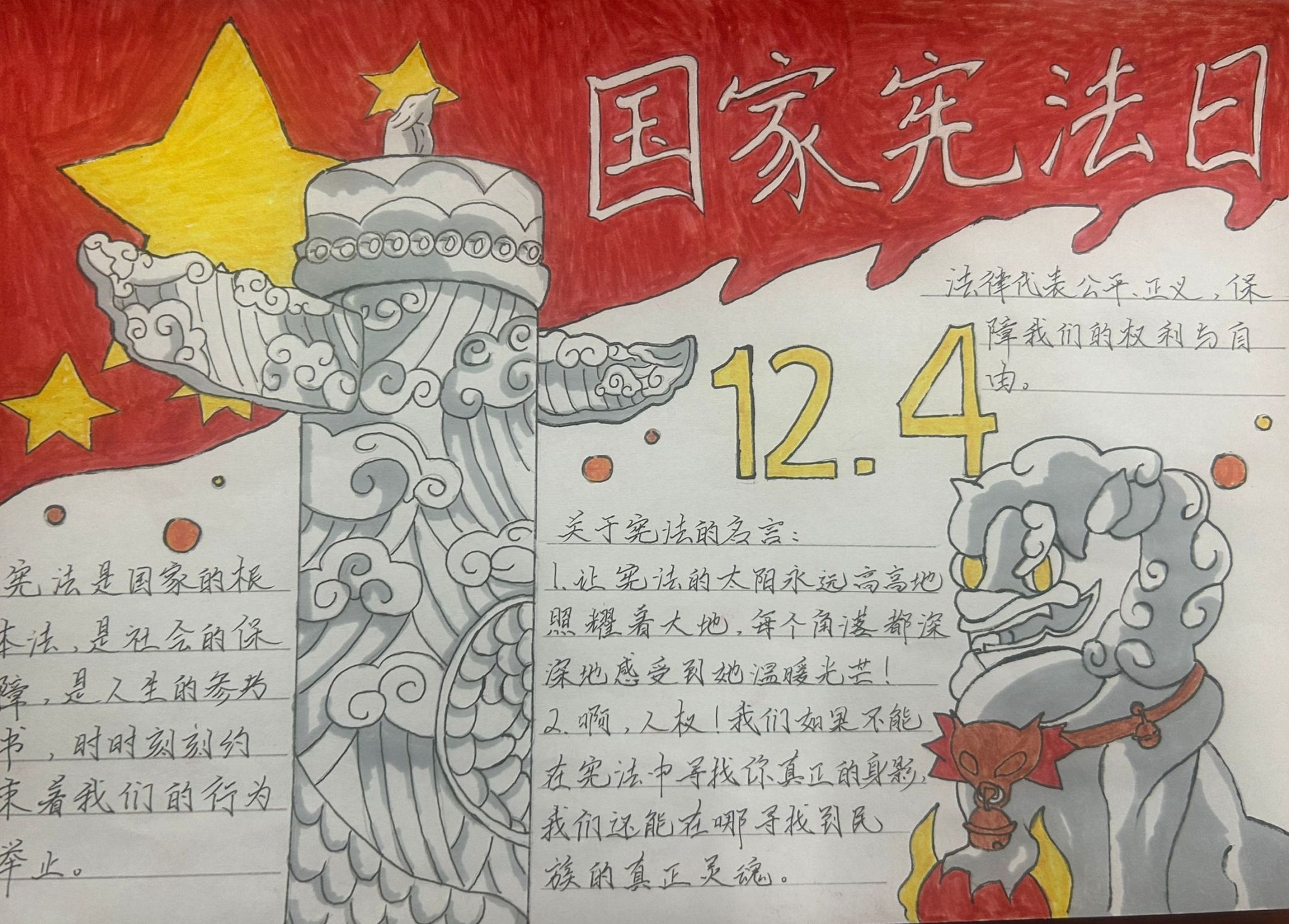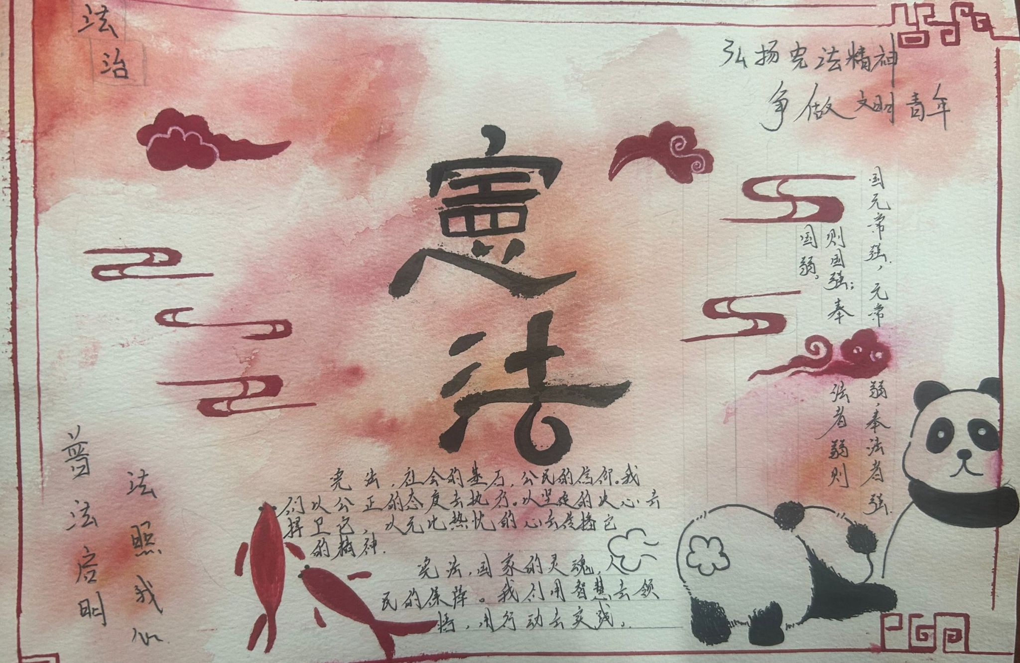 绘宪法,层层入行。学生们创新宪法宣传模式,通过绘制宪法宣传海报,将宪法的抽象概念具象化。一幅幅色彩鲜明、寓意深刻的绘画作品,不仅美化了校园环境,更让宪法精神深入人心。来自商务英语专业的大二同学张梓欣介绍道:“海报作为一种直观的艺术表现形式,能够加深师生对宪法内容和精神的感知与记忆,是法治文化推广的重要途径。”学院团总支书记邬金说:“学生们以实际行动让宪法精神在心里生根开花,不仅增强了学生学法用法的积极性和主动性,而且营造了浓厚的尊法、学法、守法、用法氛围,为法治校园建设夯实基础。