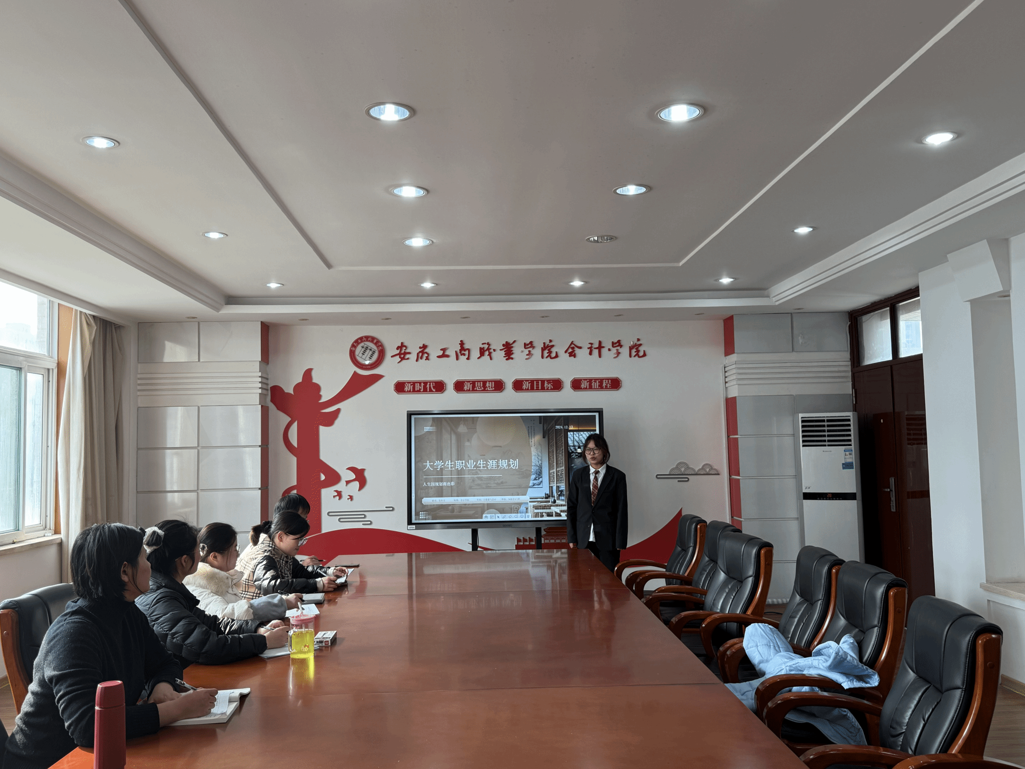 12 月 13 日,会计学院大学生职业生涯规划大赛在明德楼党建会议室精彩上演,学院精心准备,邀请专业老师作为评委,20多位同学报名参加现场比赛。本次大赛以“筑梦青春志在四方,规划启航职引未来”为主题,让“时代新人铸魂工程”落实落地,旨在引导学生树立正确的职业观与择业观,提升职业规划能力。