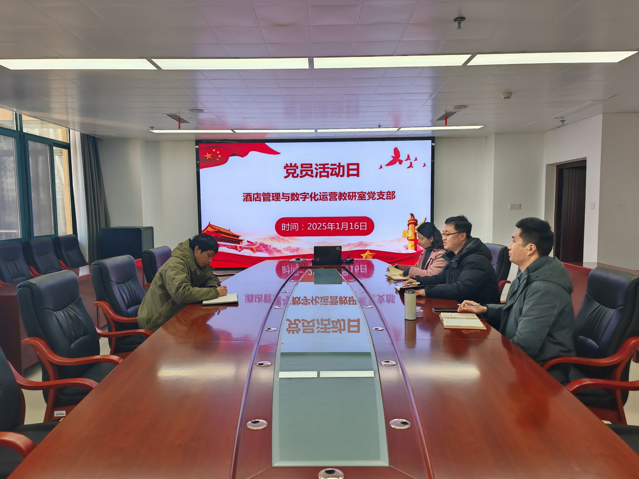2025 年1月16日,旅游健康学院酒店管理与数字化运营教研室党支部在综合楼第四会议室举行党员活动日学习活动,全体党员参加学习,活动由支部书记王彦龙主持,校党委委员、纪委书记吴松飞以普通党员身份参加学习。