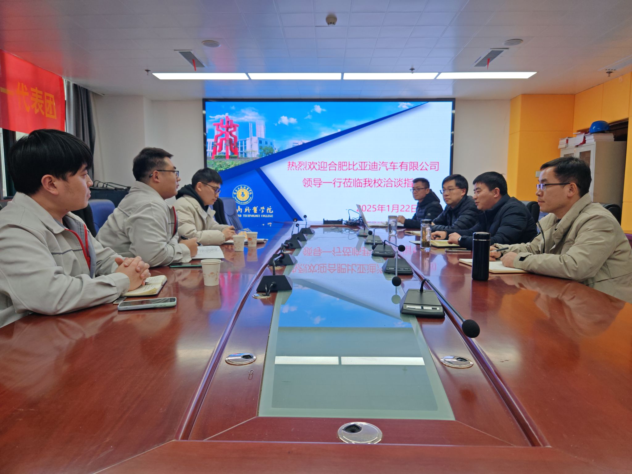1月22日下午,合肥比亚迪汽车有限公司第十四事业部人事负责人高仲林、公司校企合作负责人田轩铭等一行3人到访智能制造与汽车学院,与校方就产学研合作,特别是共建“比亚迪新能源汽车现代特色产业学院”开展交流。智能制造与汽车学院院长姚庆锋,党总支副书记盖昊宇,副院长任远林,智能网联汽车技术专业负责人吴风波参加了洽谈。