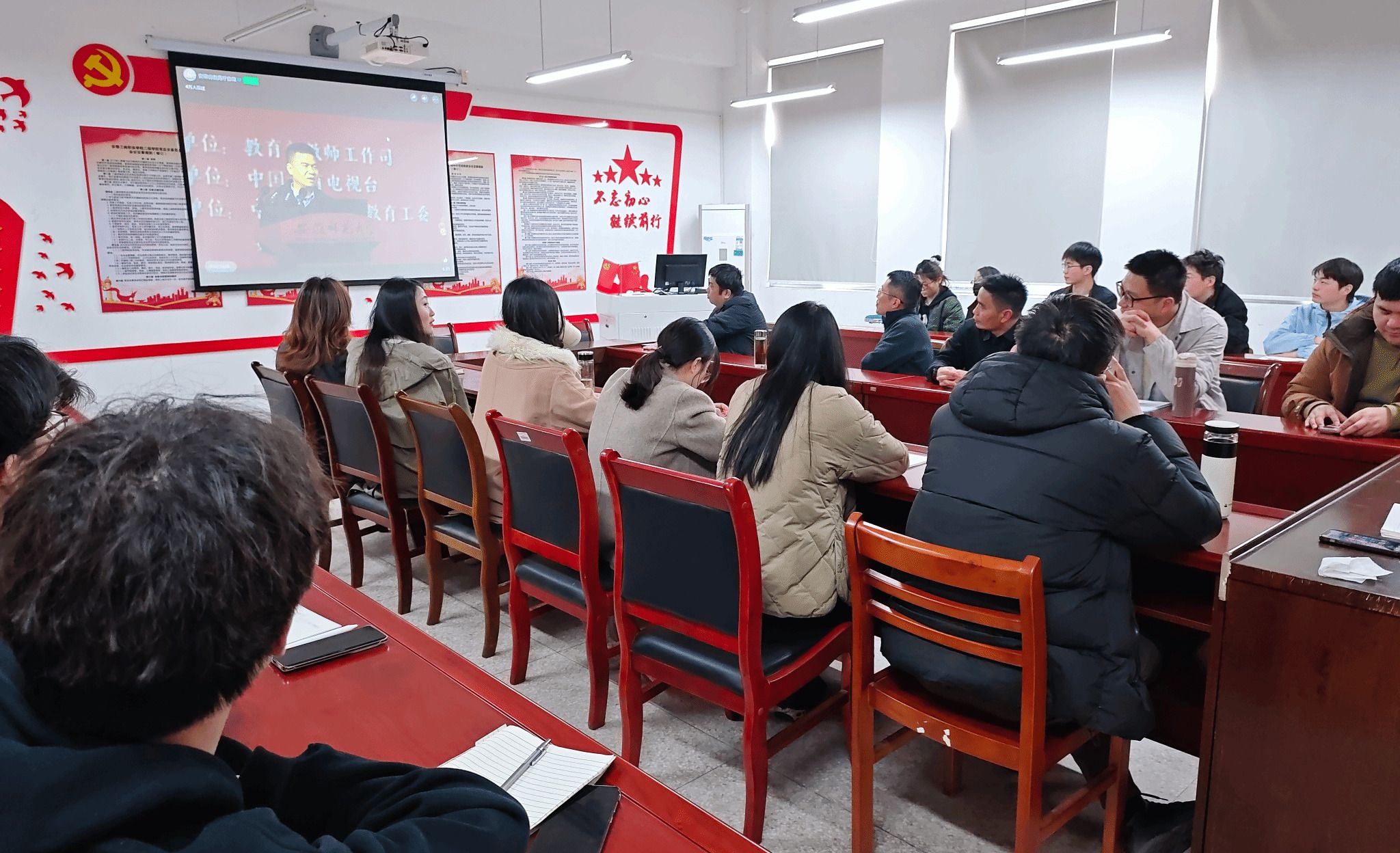 为深入学习贯彻党的二十大精神,弘扬新时代教育家精神,2月27日下午艺术设计学院党总支副书记张乐、副院长邱志斌以及部分师生代表,在学院党员活动室集中观看教育部主办的“教育家精神2025年巡回宣讲”线上直播活动。