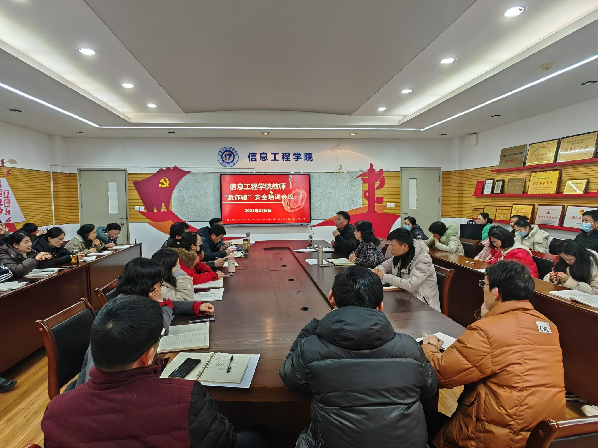 3月5日中午全体教师会上,党总支安排陈夺对信息工程学院全体教师进行了反诈防骗宣传培训,会议部署了“学院领导-授课老师-班级辅导员”三级联动机制,学院领导进一步压实主体责任,提高重视程度,主动深入课堂和宿舍宣传引导,关注诈骗案件频发班级,敦促总结经验教训并及时整改;教师层面要结合学校要求,一个班不漏的开展专题防骗教育,并将反诈防骗教育融入课程思政,利用课前、课中、课后,教育和引导学生认清诈骗套路,谨防上当受骗;辅导员层面要创新工作方法,主动了解各种诈骗方式和防骗技巧,多措并举提升学生反诈意识,设立反诈安全员,监督室友日常网络行为,发现异常及时上报?。