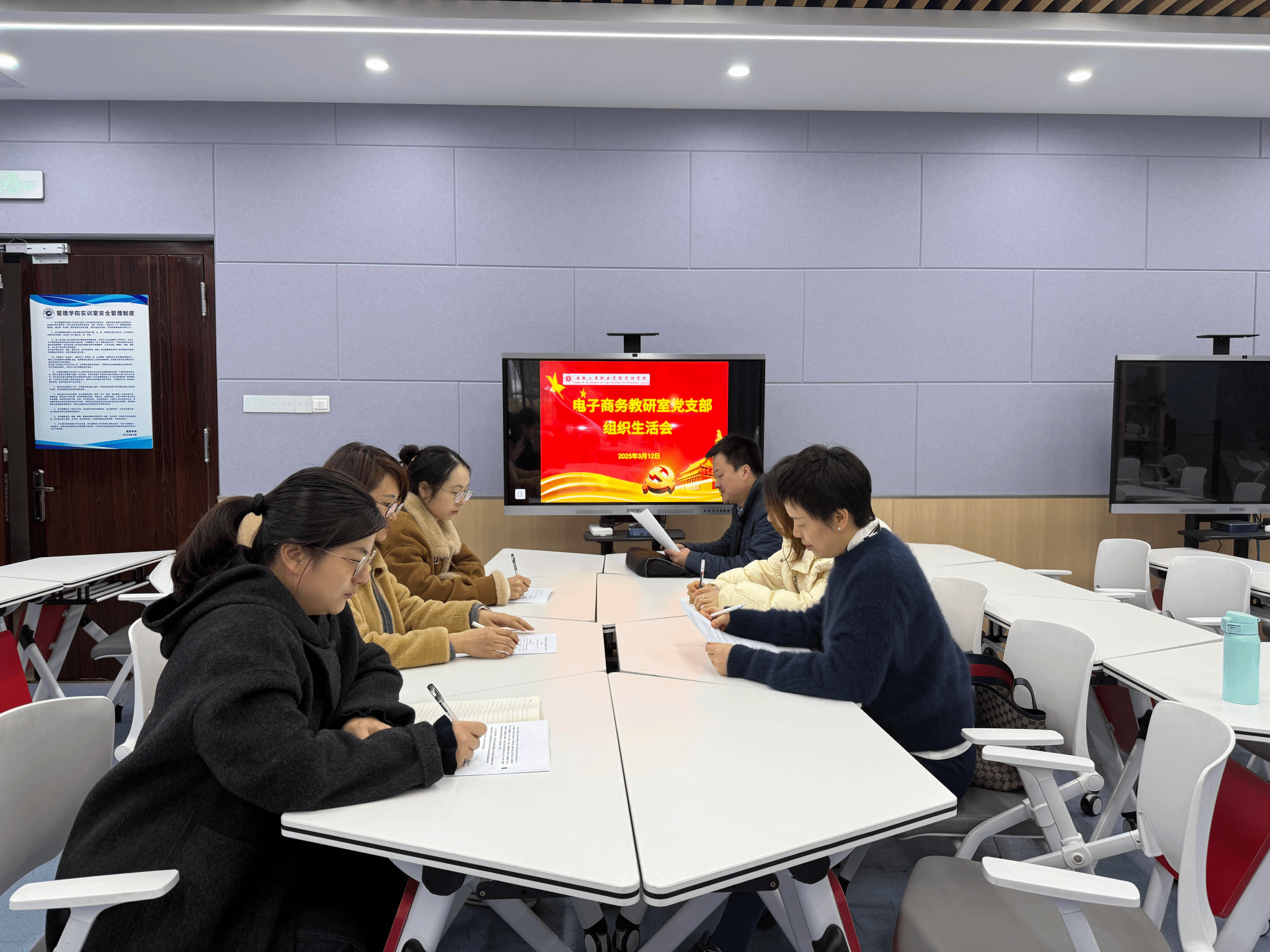 3月12日中午,管理学院电子商务教研室党支部在103实训室召开2024年度组织生活会,会议由支部书记漆悦主持,支部全体党员参会,总支委员、副院长倪伟到会指导。