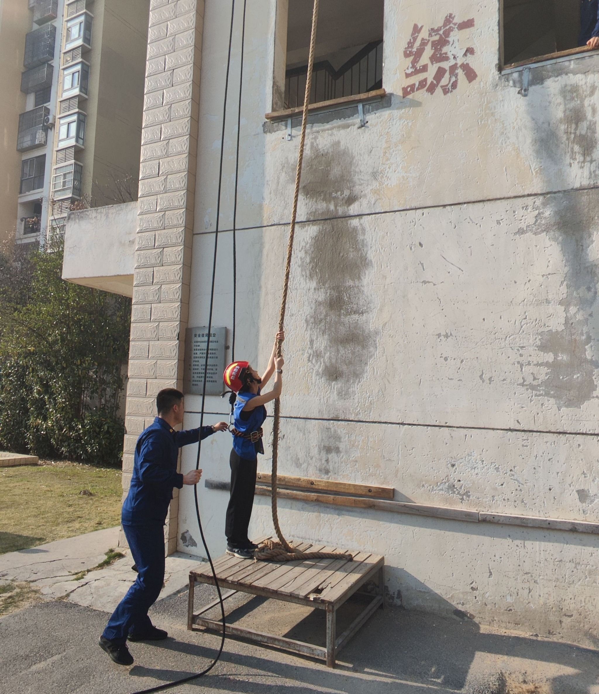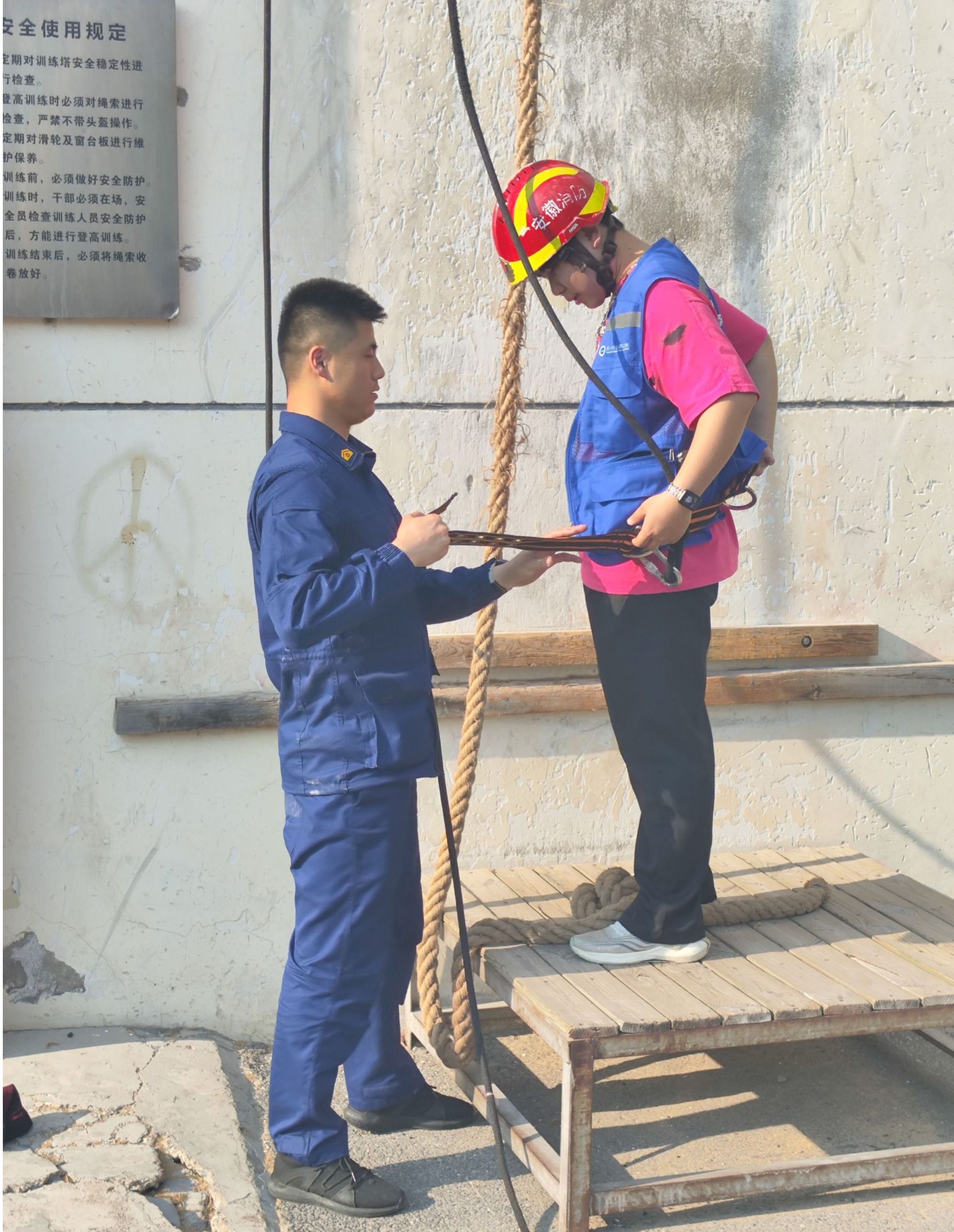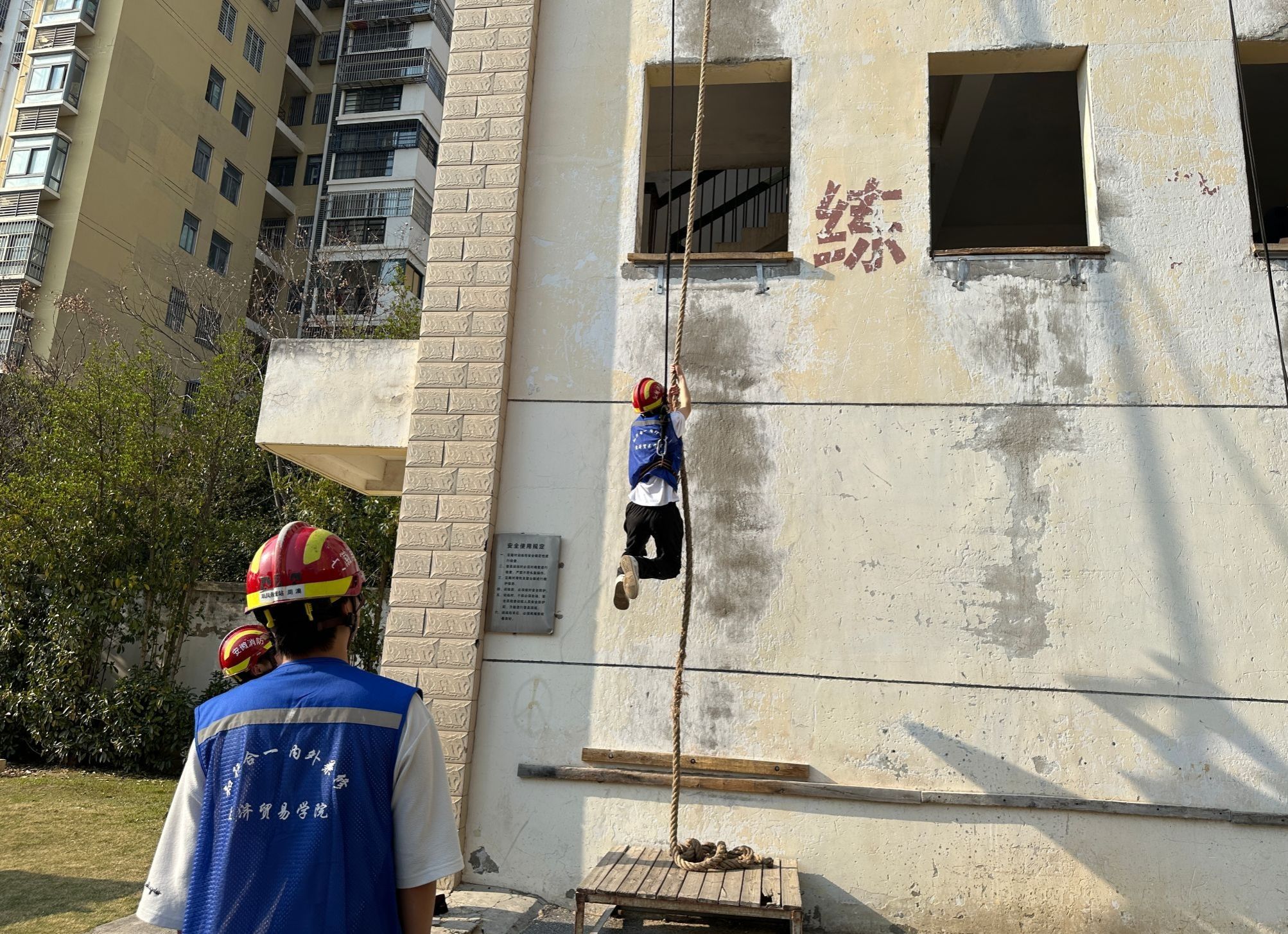 在消防员的带领下,学生们有序参观了消防车辆、灭火救援装备和训练场地。消防员结合日常救援经验,详细介绍各类器材的功能及使用方法,现场演示液压破拆工具、高压水炮等专业设备的操作技巧,并邀请学生穿戴消防服、体验绳索攀爬训练,沉浸式感受消防救援的复杂性与危险性。“穿上约15公斤的装备,我连走路都困难,难以想象消防员们要穿着它冲进火海救援,他们用血肉之躯守护万家平安,是当之无愧的英雄!”2023级国贸专业学生何星锐同学在体验后感慨道。