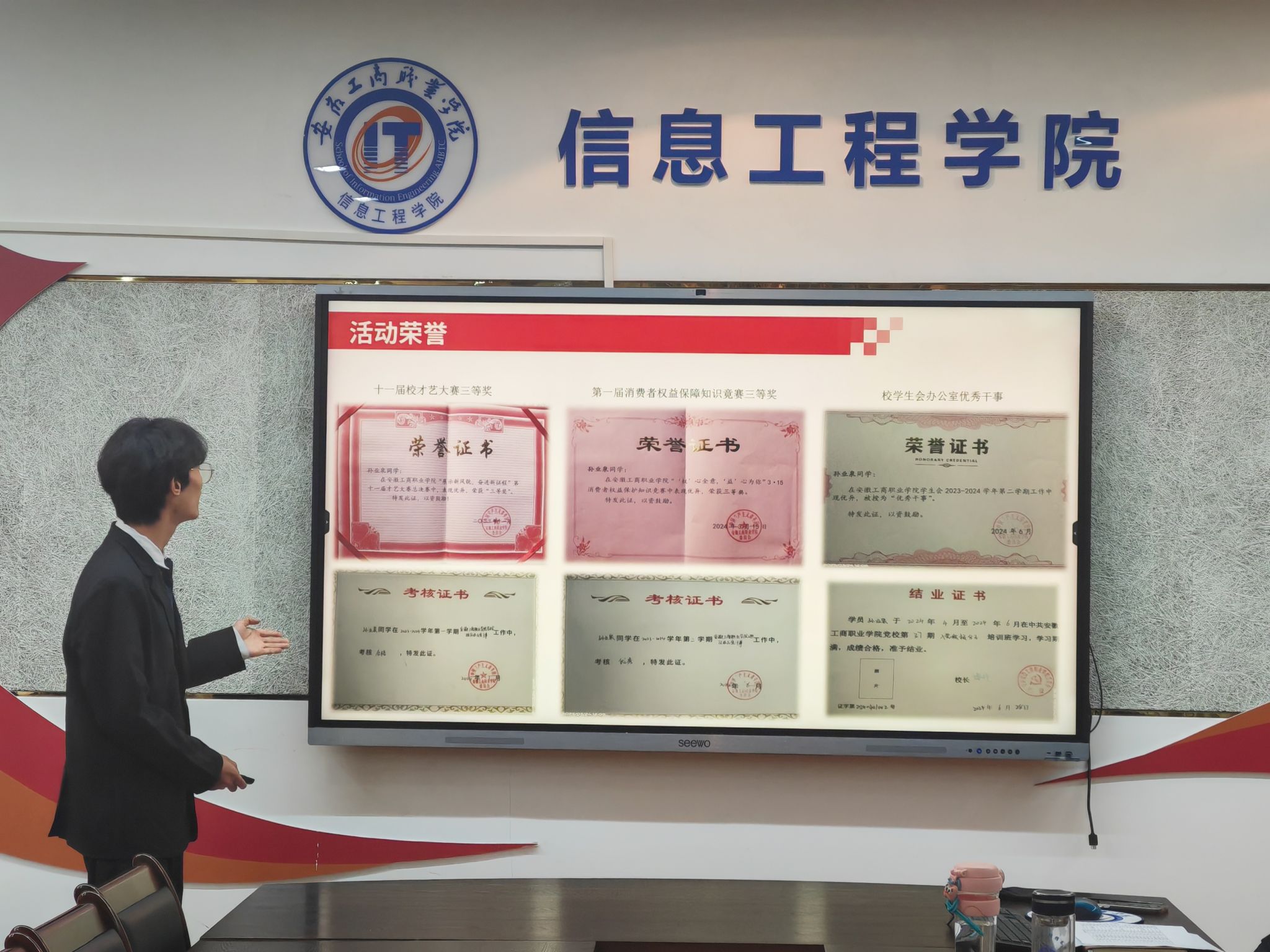 为深入贯彻落实立德树人根本任务,发挥先进典型的示范引领和青年学生朋辈教育作用。3月26日下午,信息工程学院开展2024年“十佳大学生”评选表彰工作。学院党总支副书记陈夺、办公室主任徐祥辉、教务科科长杨静、组织员彭梦冉、团总支书记胡梦佼,以及部分辅导员参加活动并担任评委。