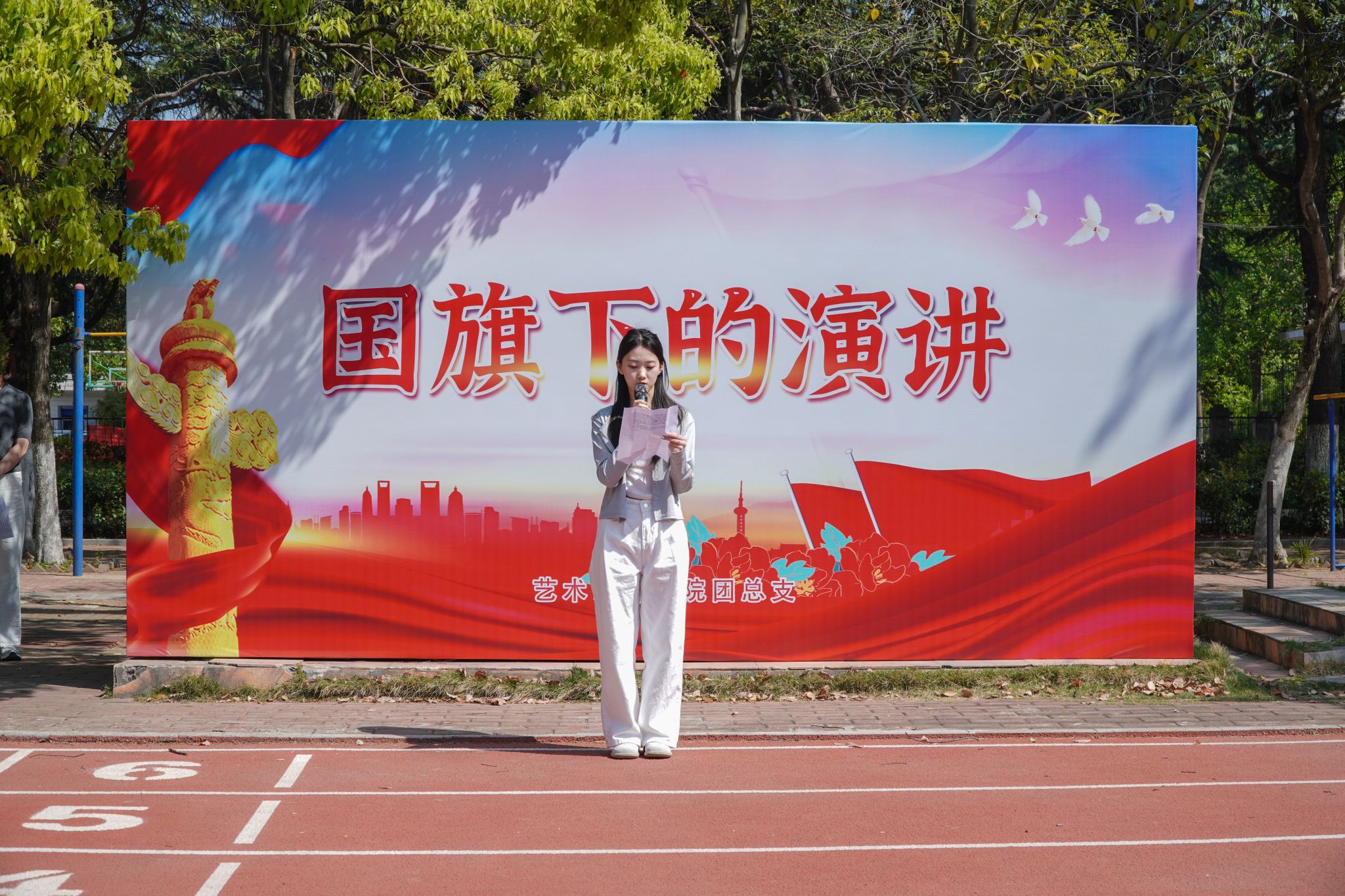 为深入学习贯彻党的二十大精神,筑牢国家安全防线,共绘新时代平安中国画卷,在第十个“全民国家安全教育日”之际,我院开展“国旗下的演讲”爱国主义教育活动第十期。4月15日上午,艺术设计学院院长魏芬、党总支副书记张乐、副院长邱志斌带领全校师生900余人参加了此次活动,活动由艺术设计学院团总支书记赵文卿主持。