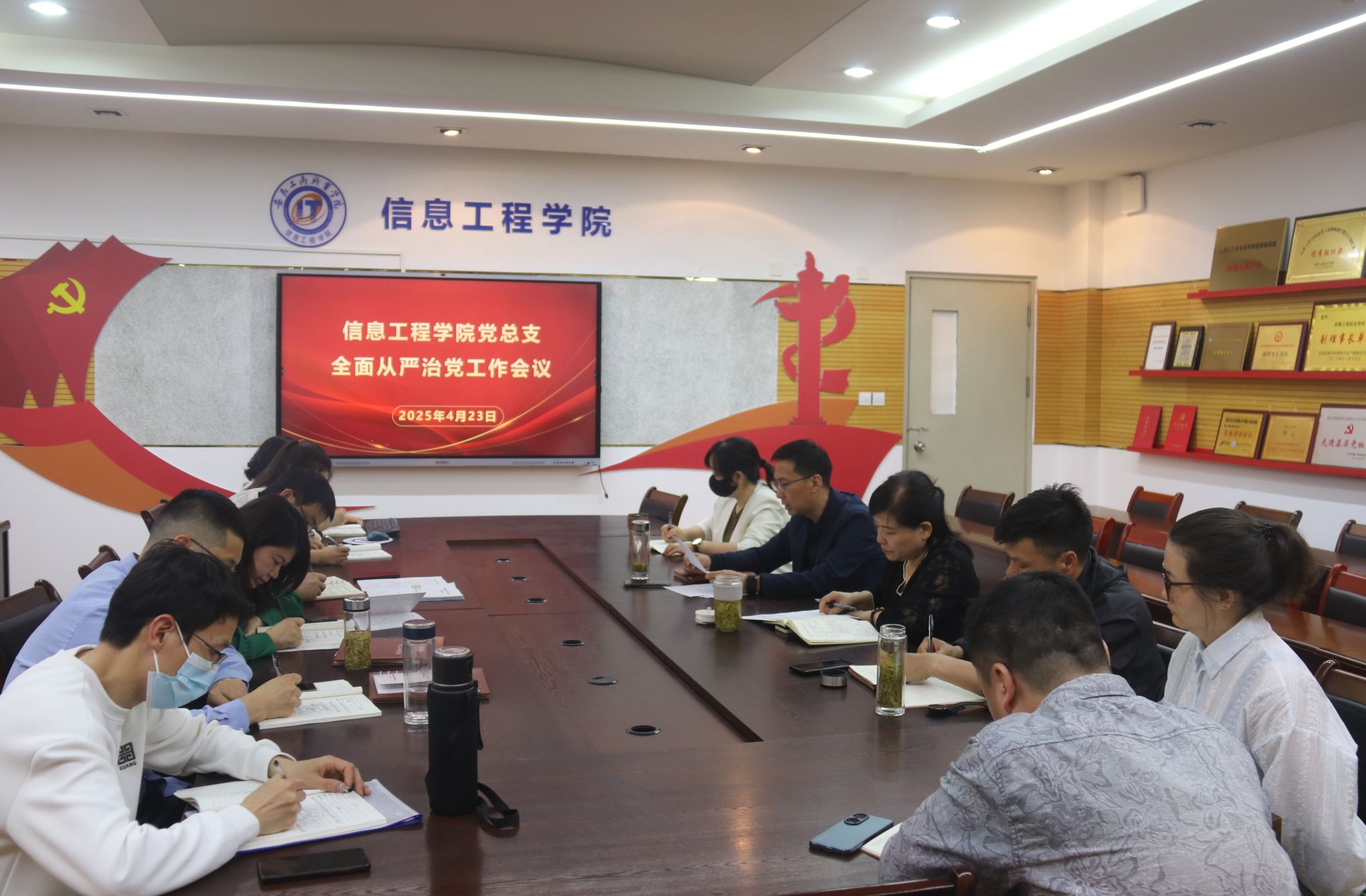 4月23日下午,信息工程学院党总支在党员活动室召开2025年全面从严治党工作会议。党总支全体委员、党支部书记、教研室正副主任参加会议,会议由党总支书记张静雯主持。
