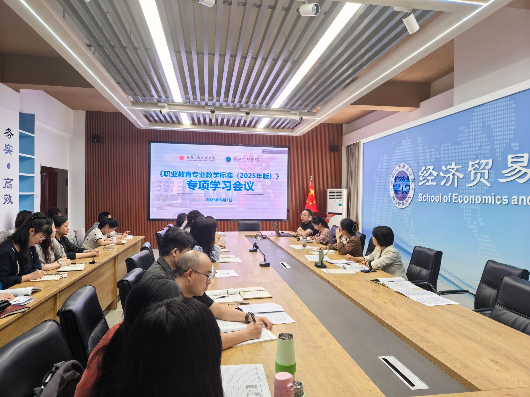 为贯彻落实《教育强国建设规划纲要(2024-2035年)》文件精神,提升专业建设水平,打造“金专”,推动教育教学高质量发展,经济贸易学院组织开展《职业教育专业教学标准(2025年版)》(以下简称《标准》)专项学习活动。5月7日,学院组织召开《标准》专项学习会议,全体教职工参会。学院副院长张键领学文件内容,院长张颖作总结讲话。会后,各教研室围绕《标准》开展专题教研学习活动,推动学习成果转化为实践行动。