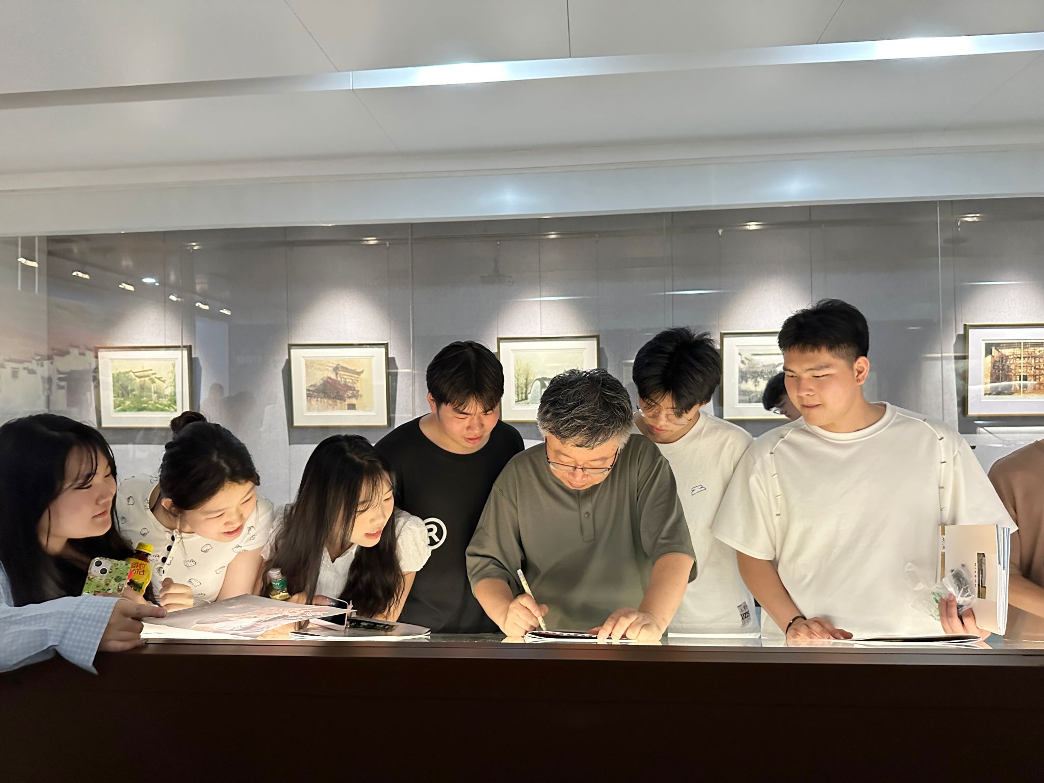 展览中,《黄山胜景》《徽州古韵》等作品吸引了师生驻足。同学们围绕“传统艺术的当代转化”与师晶老师展开讨论,提出世界第一大赌场,澳门金沙城中心设计语言与传统文化结合的问题,师晶老师一一解答,并鼓励学生:“徽派艺术的传承不仅是技法的学习,更是文化精神的延续。”活动尾声,师晶老师为同学们签名留言、合影留念,现场气氛热烈。同学们表示,此次观展不仅拓宽了专业视野,更增强了对本土文化的认同感与创作热情。