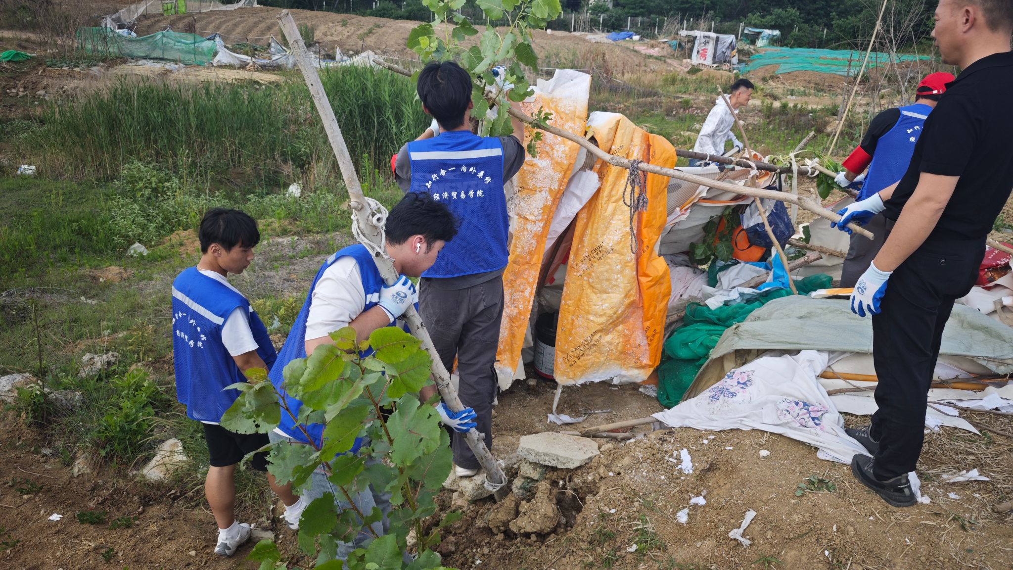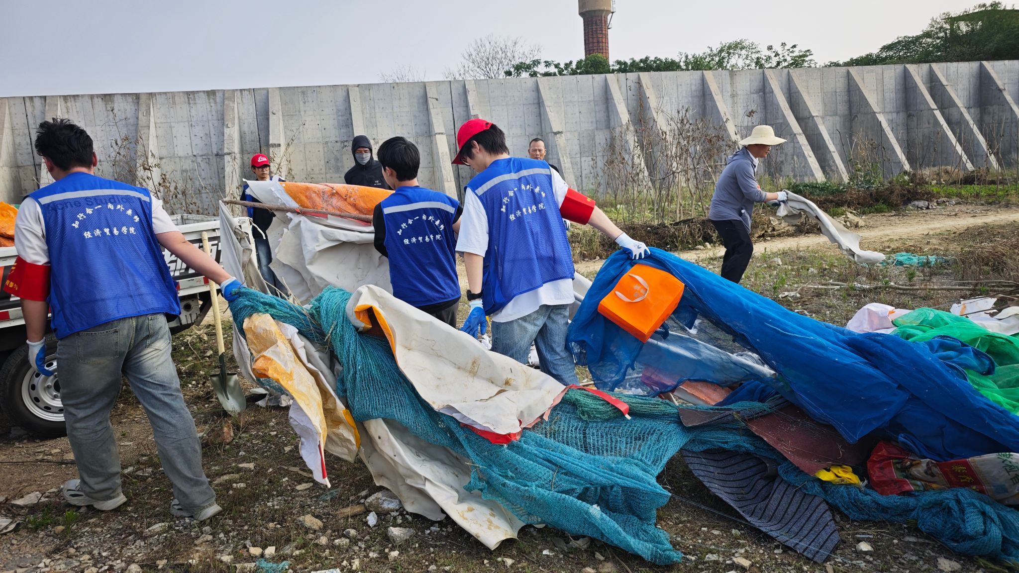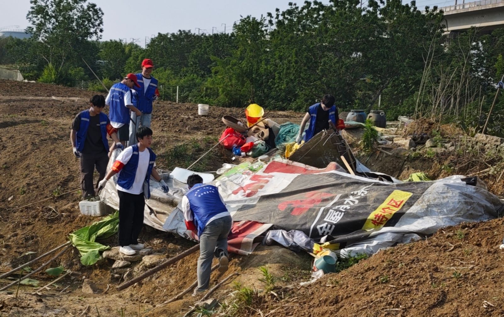 针对火车道周边空地区域存在的卫生死角垃圾堆积、违规占用公共空间私拉乱建(如简易窝棚、堆放杂物的临时构筑物)等问题,同学们手持工具,深入铁道护坡、沿线空地及周边沟渠等卫生死角,奋力清理散落的生活垃圾、废弃工业包装物、塑料薄膜、枯枝杂草等各类废弃物。汗水在衣背绘出深浅的地图,步履在热土刻下奉献的印记。本次行动重点之一,是清理严重影响铁路运行安全和环境整洁的违规建筑。在经开区城管执法人员的现场指导与安全保障下,志愿者们耐心沟通解释,协助搬运清理堆放物品,对多处违建进行了安全、有序的拆除,恢复了铁路沿线公共空间的整洁与安全秩序。