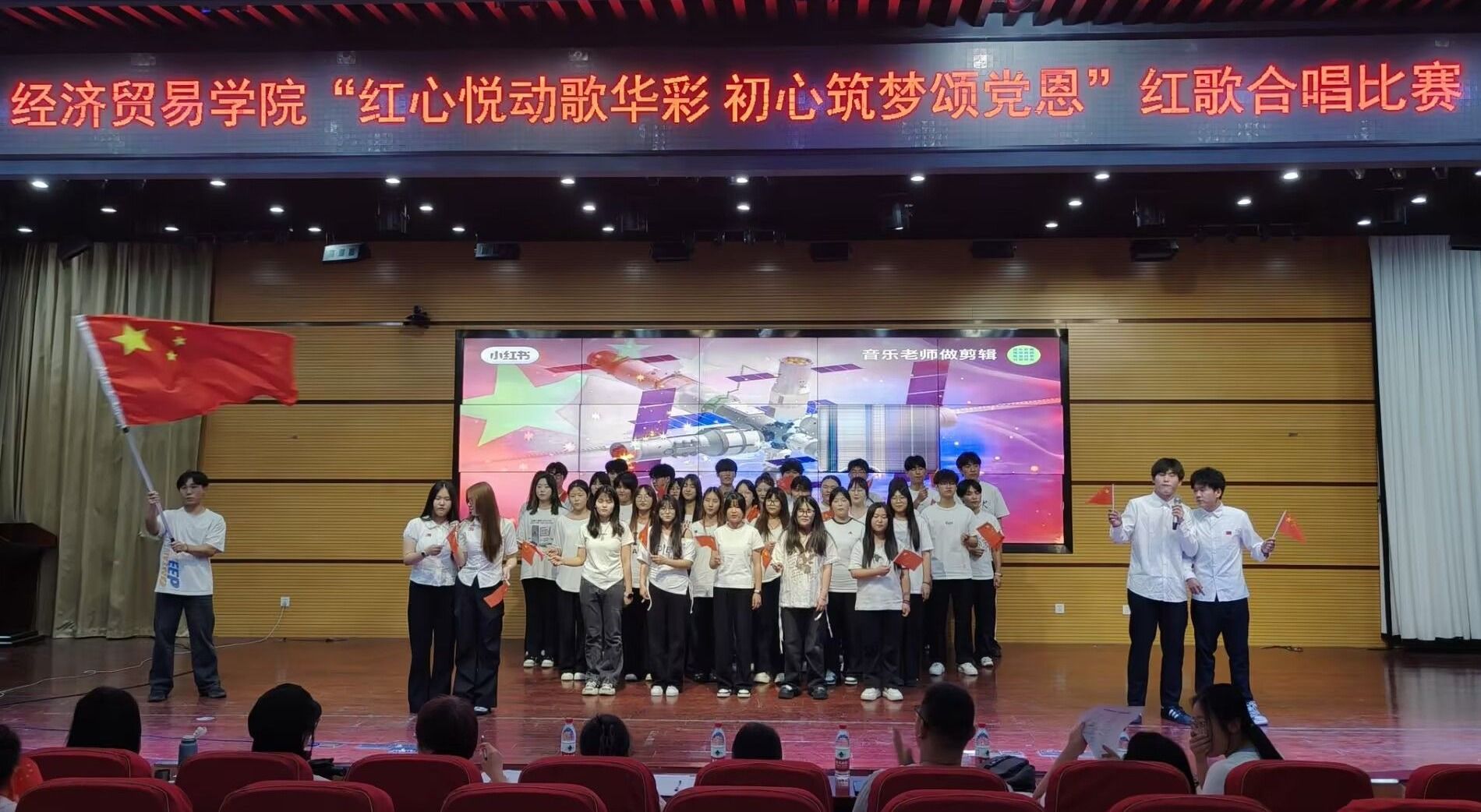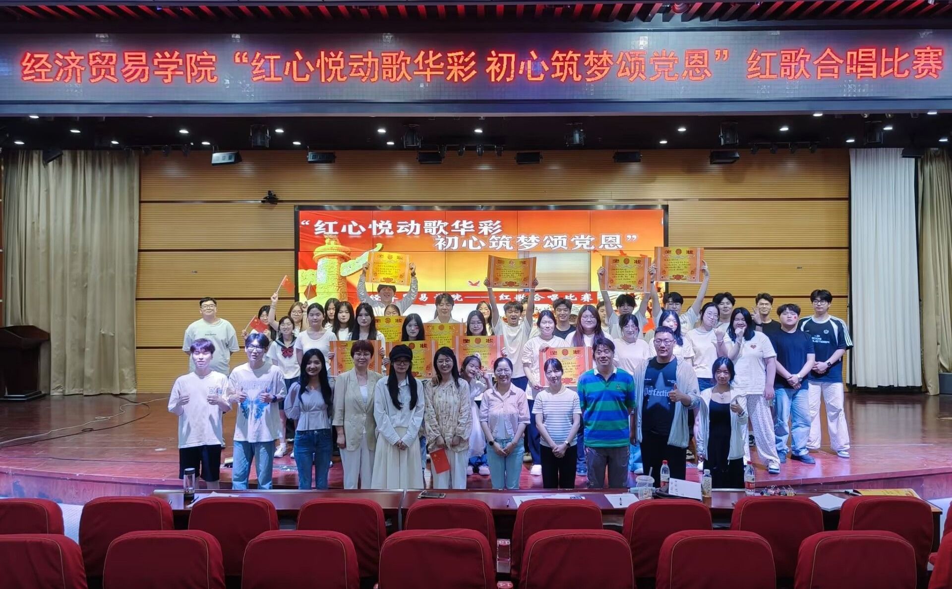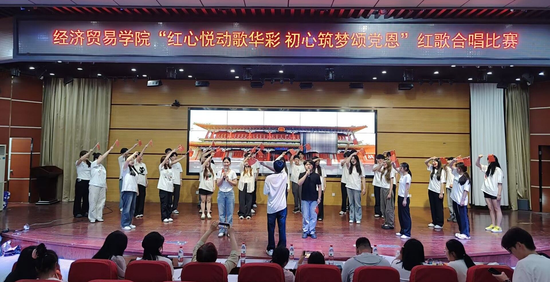 为弘扬伟大建党精神,用经典旋律重温光辉历程、唱响爱党主旋律,展现青年学子团结奋进、担当有为的时代风貌。6月5日晚,经济贸易学院“红心悦动歌华彩 初心筑梦颂党恩”主题红歌合唱比赛在学院学术报告厅隆重举行。学院各班级代表队400余名师生齐聚一堂,以嘹亮歌声唱响时代强音。