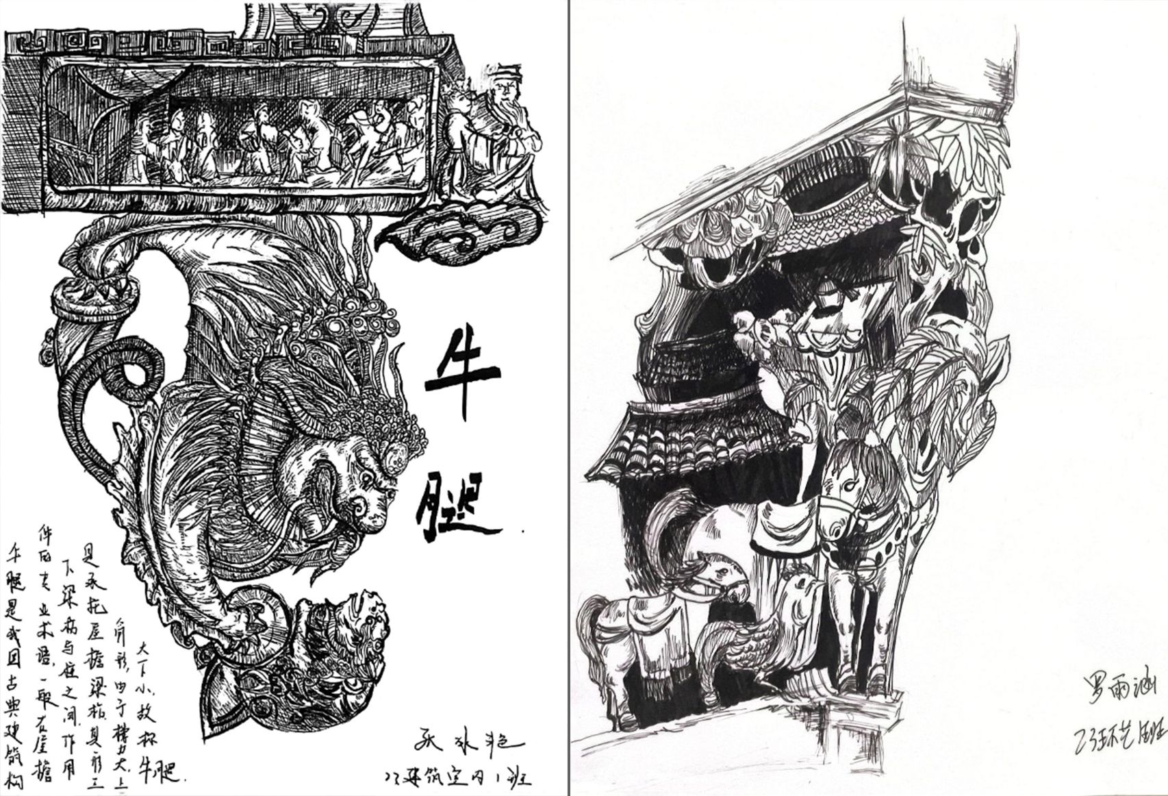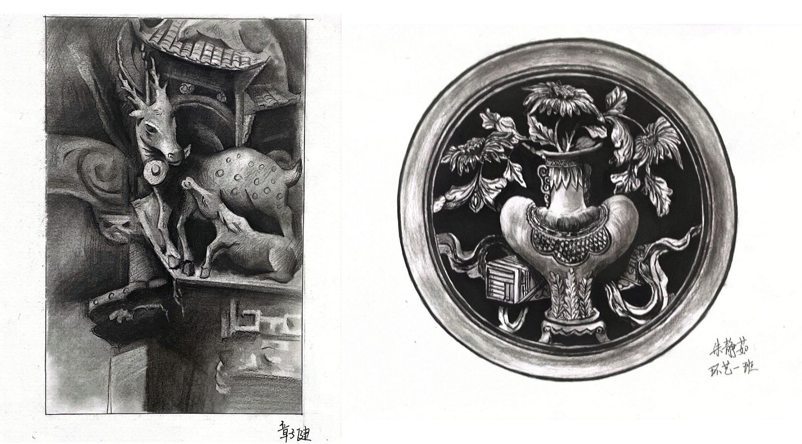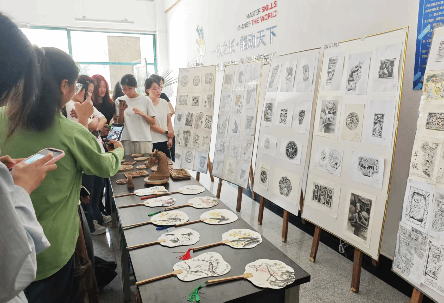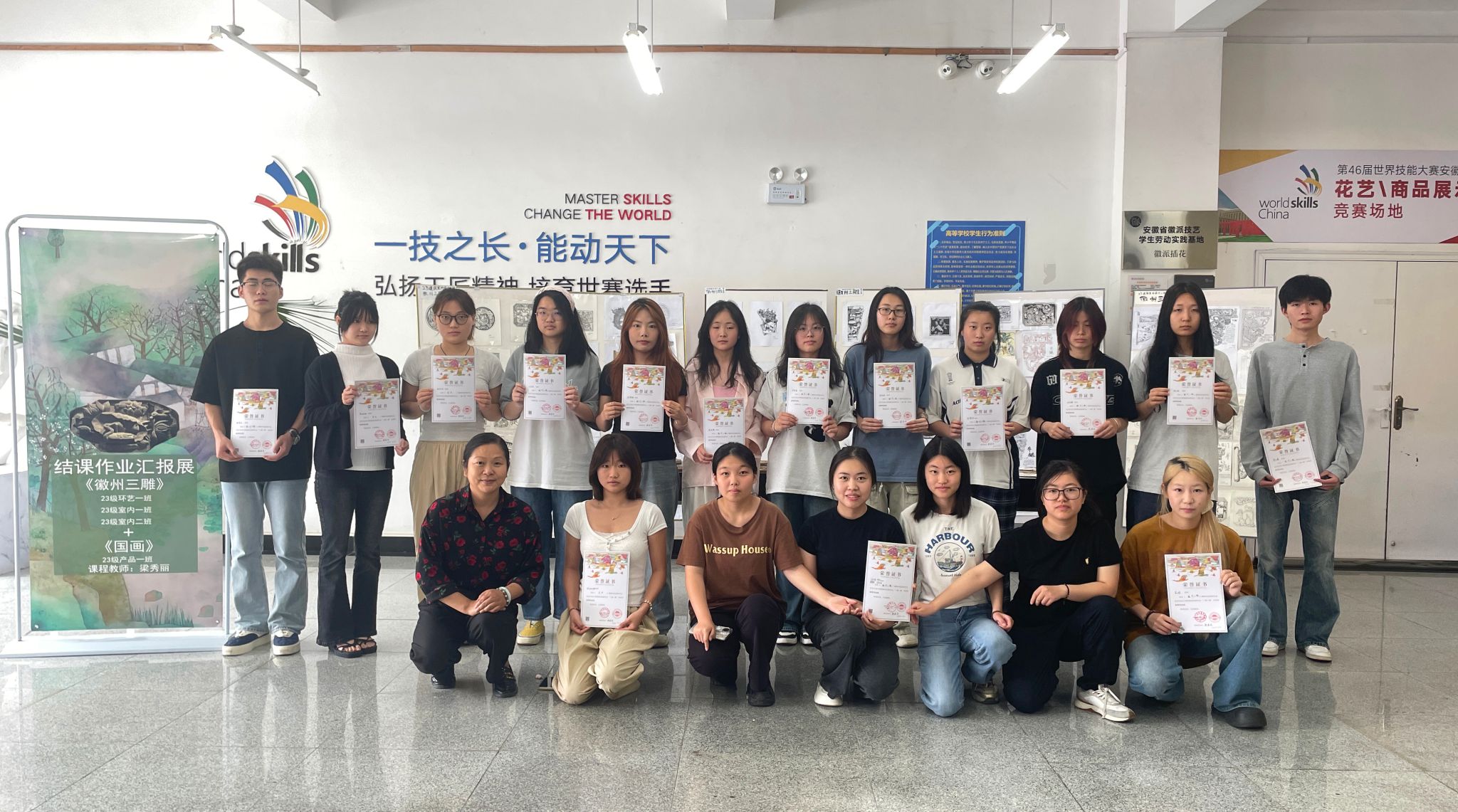 展览汇集了23级环艺设计班、23级建筑室内设计1、2班和23级产品设计1班学生的结课作业,从构图到雕刻,从笔墨运用到风格塑造,全方位展现了学子们对艺术语言的独到诠释。学生在《徽州三雕》作业展示了徽派建筑撑拱、花板、月梁、梁柁等构件的手绘与雕刻作品琳琅满目,风格多元,特色鲜明。同学们从初次接触刻刀时的青涩,到如今能熟练运用雕刻技巧,将对非物质文化遗产徽州三雕的热爱与崇敬融入刀工,于方寸之间雕琢出传承之光。23级产品设计1班同学的《国画》作业,以笔墨绘就春日盛景,花鸟灵动、鱼虫生机,笔下万物皆是春天的灵动音符。