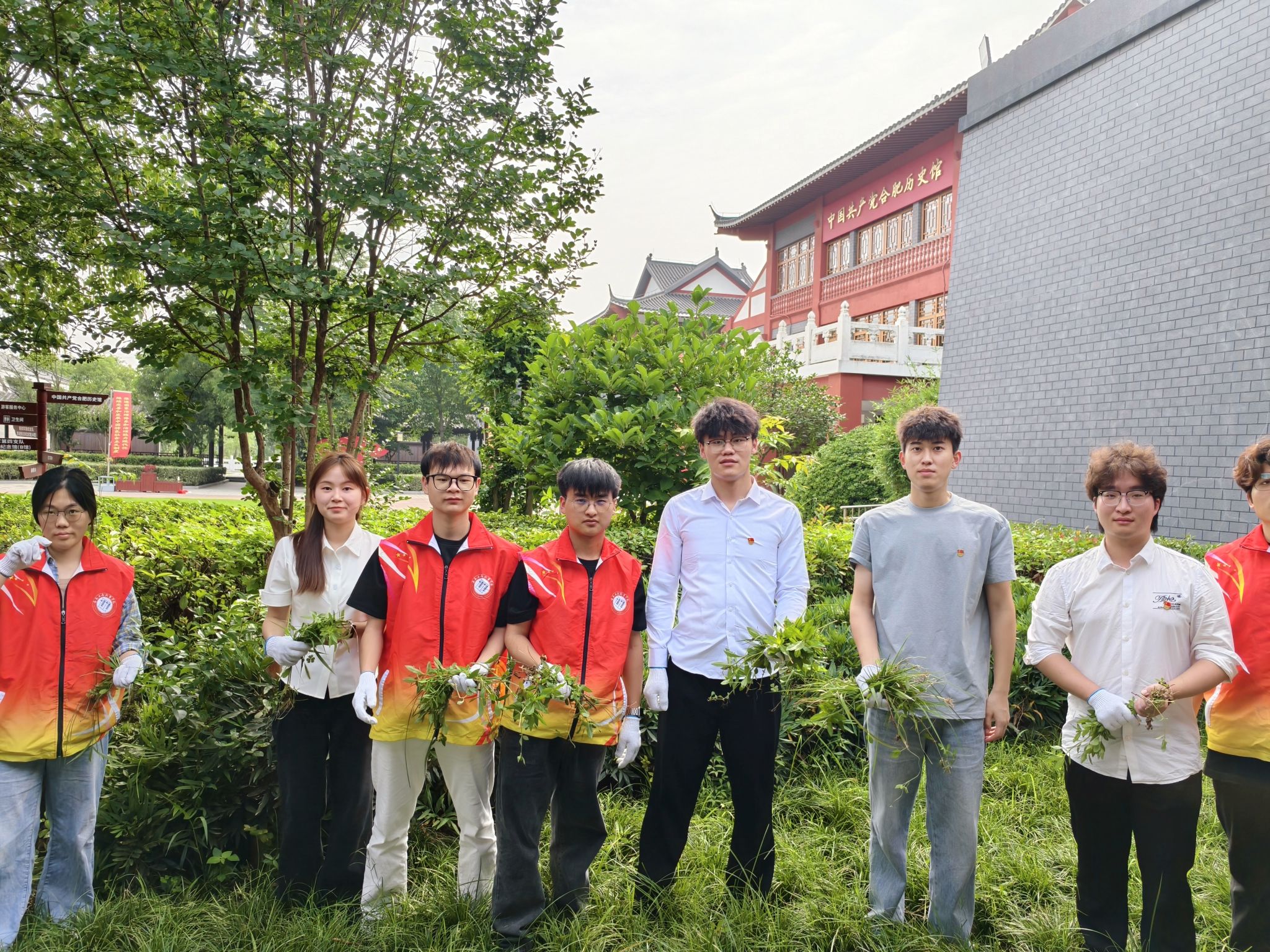 作为党建与劳动教育深度融合的创新实践,本次活动主要是对合肥党史馆绿化带的杂草进行清理。活动现场,全体成员统一佩戴党员徽章,身着醒目的志愿服装,在负责人的统筹安排下,按照划定区域迅速展开劳动。大家分工明确、配合默契,有的弯腰拔除顽固杂草,有的仔细清理碎石杂物,在确保不损伤周边绿植的前提下,对卫生死角进行 “地毯式”清理。尽管骄阳似火,汗水浸透衣衫,但党员们始终干劲十足,用沾满泥土的双手诠释着不怕脏、不怕累的奉献精神。