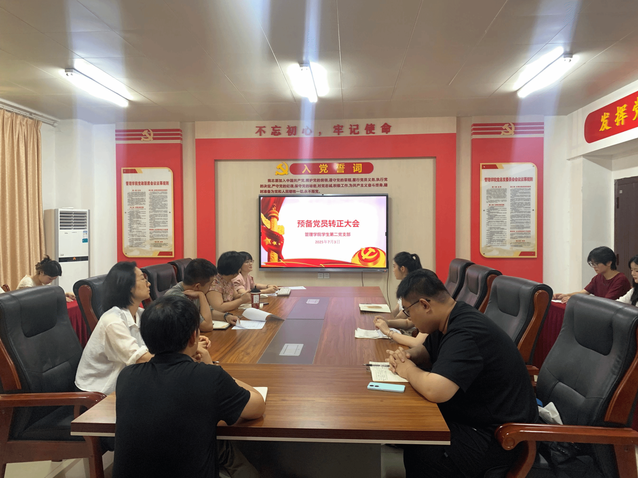 为进一步壮大学院党员队伍,提升党支部的战斗力和凝聚力,2025年7月3日,管理学院学生第二党支部在学院党员活动室召开预备党员发展暨预备党员转正大会。会议由学生第二党支部书记毕筱菁同志主持,支部全体师生党员参加。
