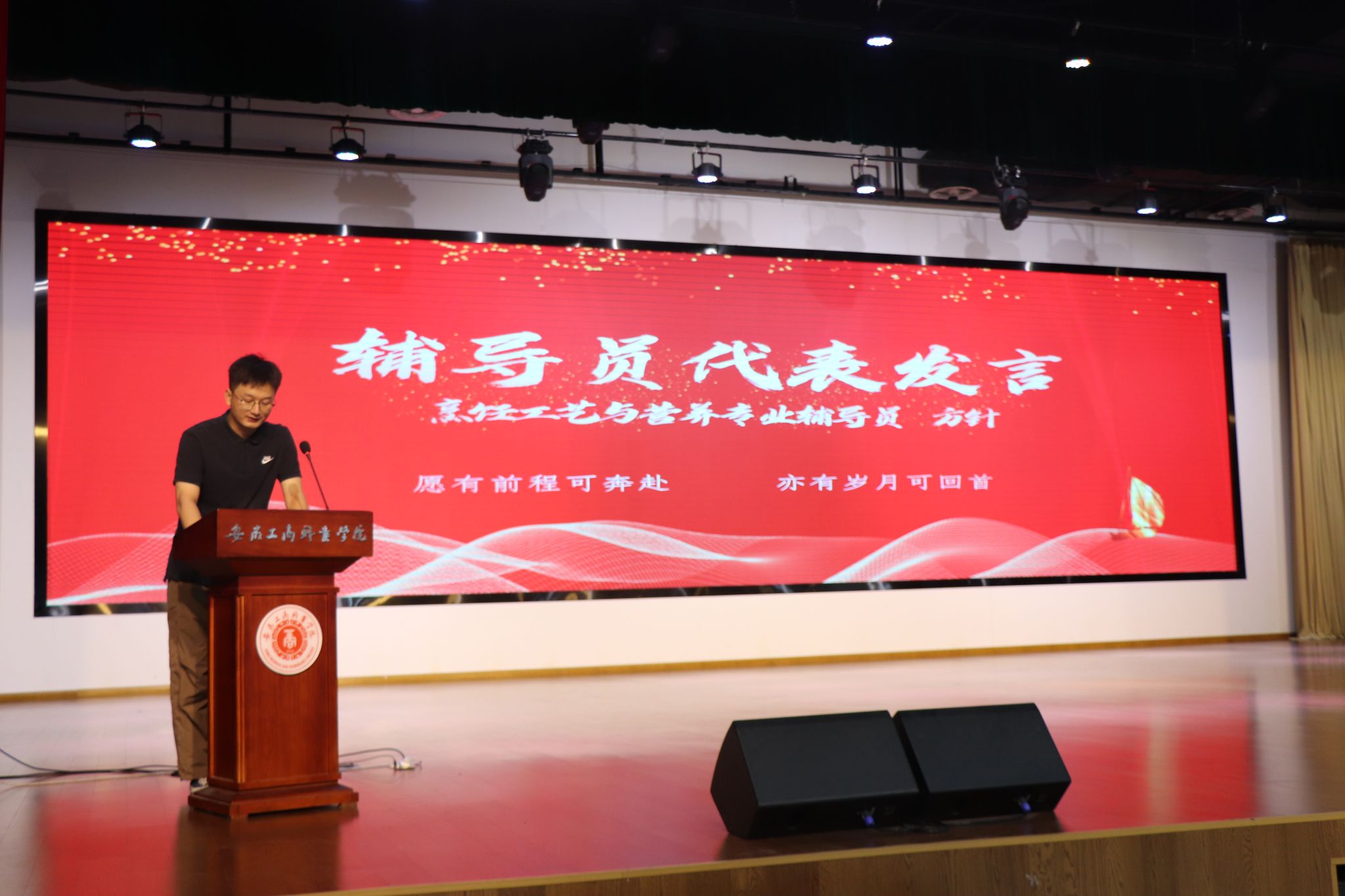 烹饪工艺与营养专业教研室副主任郑帅帅和毕业班辅导员代表方针老师分别上台发言,对同学们表达了依依不舍与美好祝愿。随后2026届毕业生丁双双同学代表全体毕业生发言,他表示将谨遵老师教诲,牢记母校恩情,用光荣的业绩为母校增光。